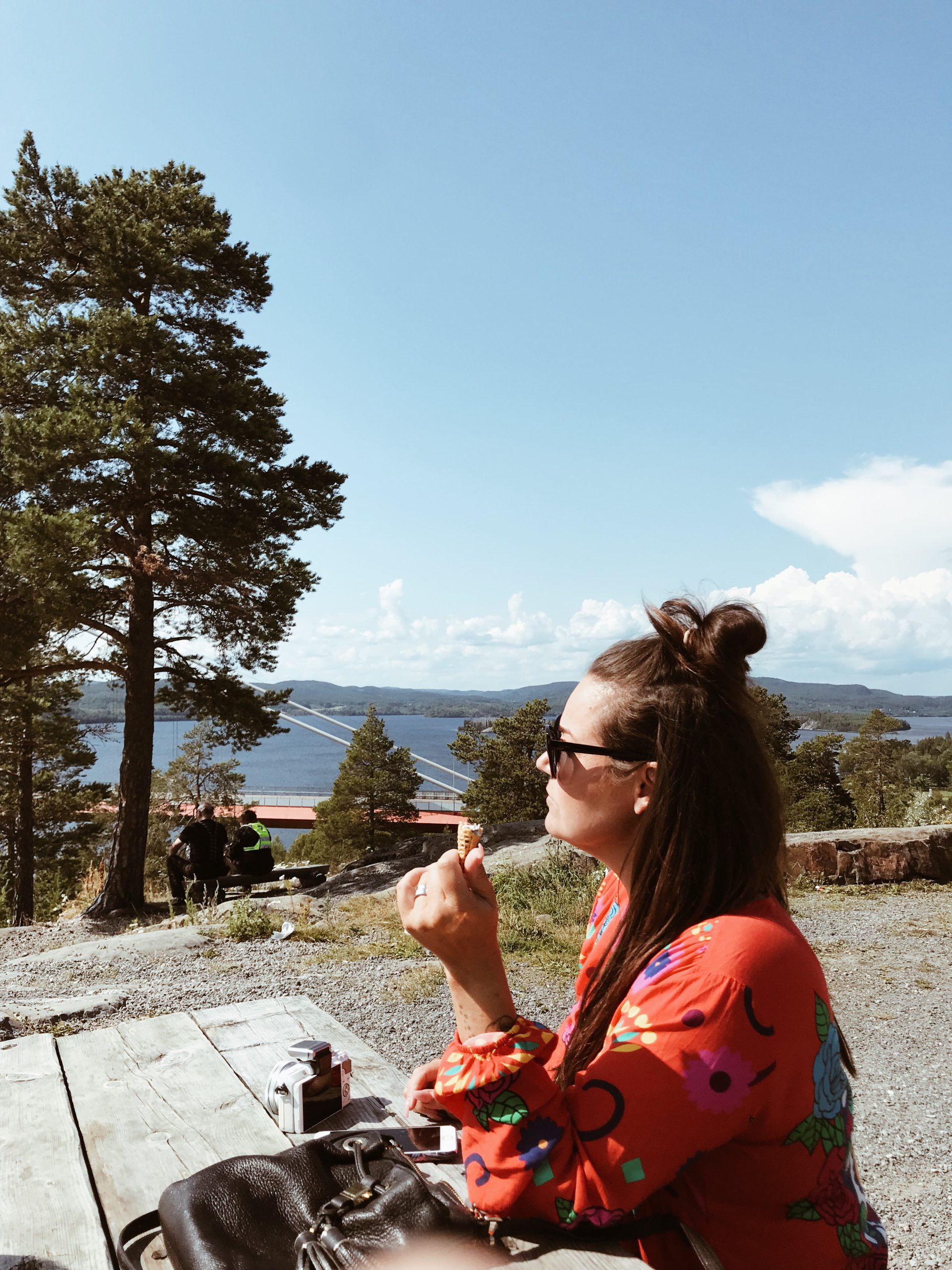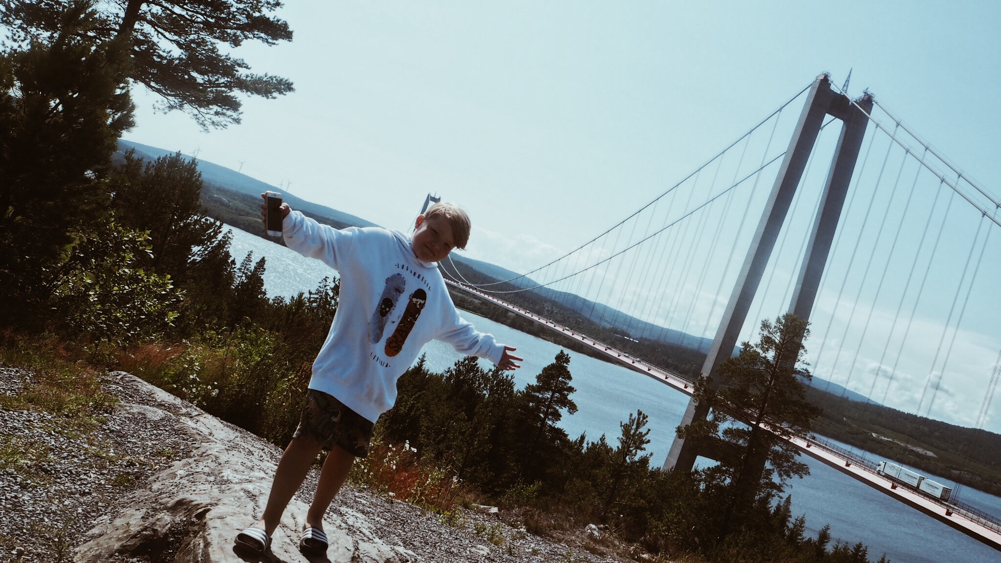Vi stannade till ytterligare en gång på vägen hit. Underbara Höga Kusten. Det är verkligen ”breathtaking” att bara stå här och titta på den sjukt maffiga bron. Vi käkade glass och njöt av utsikten. Milo körde parkour och sprang av sig lite. Perfekt för att orka sitta i bilen i timmar.