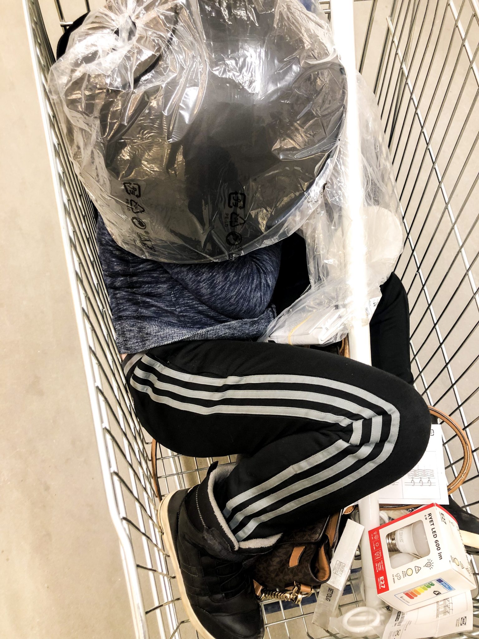 Är man trött så är man! Haha…. han fick plats i korgen på Ikea och fick gömma sig under en lampskärm.