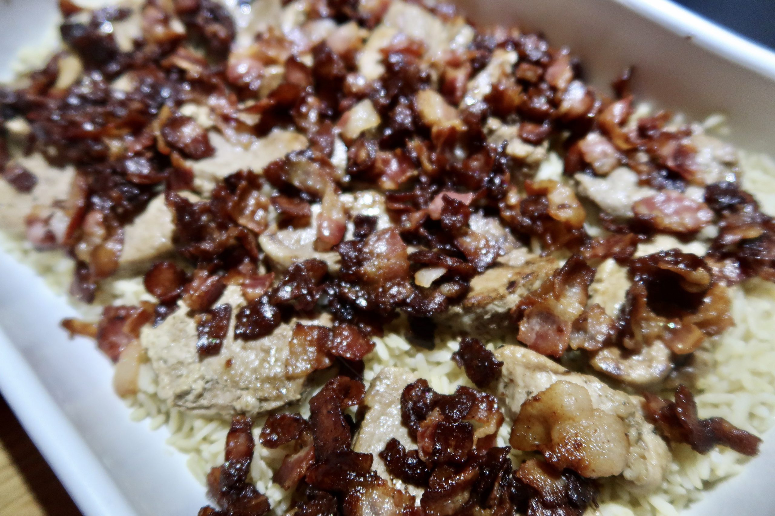 3) Ta fram en ugnsform. Lägg i det kokta riset i botten. Fördela ut fläskfilén uppepå det. Strö sist ut baconen över.