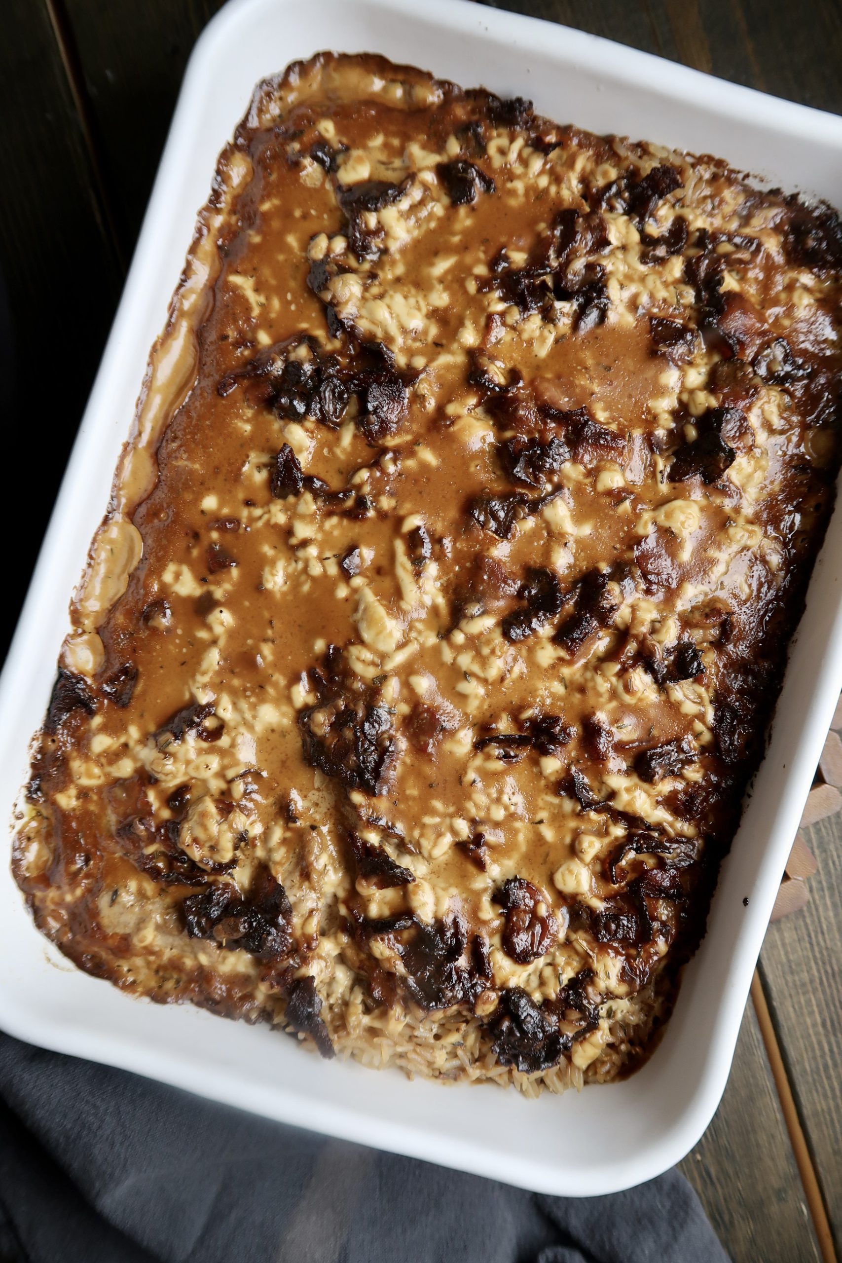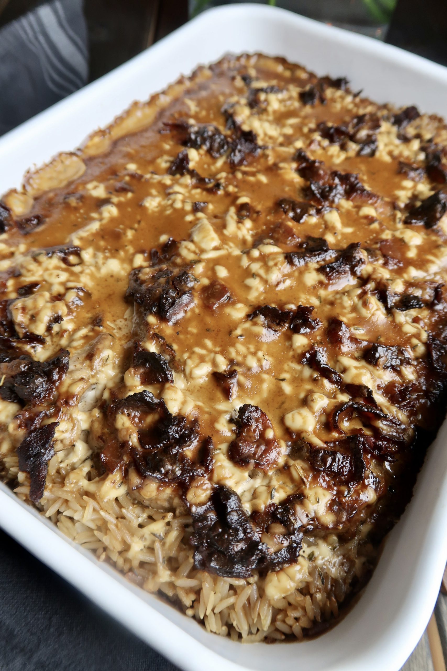 4) Blanda creme fraiche, grädde, fonder, soja, timjan, kryddor och färskosten i en bunke. Vispa ordentligt. Häll sedan över ris, fläskfilé och bacon.