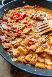 1) Koka ris enligt anvisningarna. Rensa och skiva fläskfilén. Stek den på ganska så hög värme, den ska få färg på båda sidorna. Lägg skivorna i en skål efter du stekt klart.