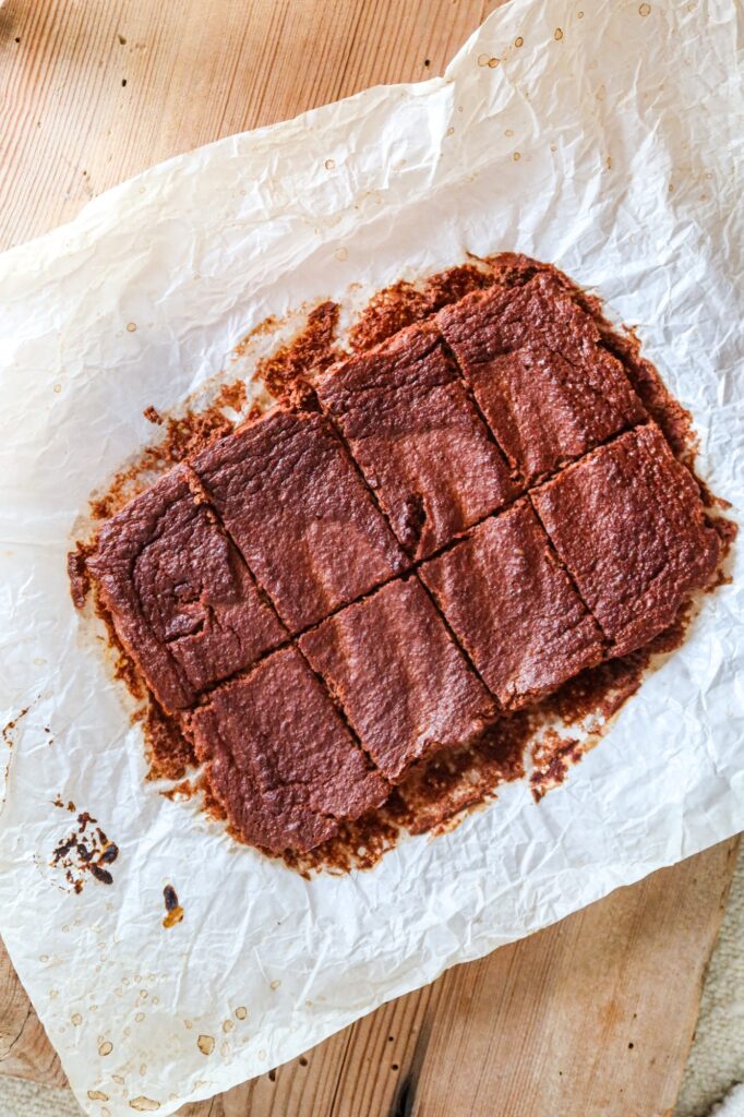 4. Ha i bakplåtspapper i en liten ugnsform, min är ca 20×25 cm. Tips: Blöt ned pappret under kranen, vrid om försiktigt så vattnet pressas ur och lägg sedan i formen, så mycket lättare.