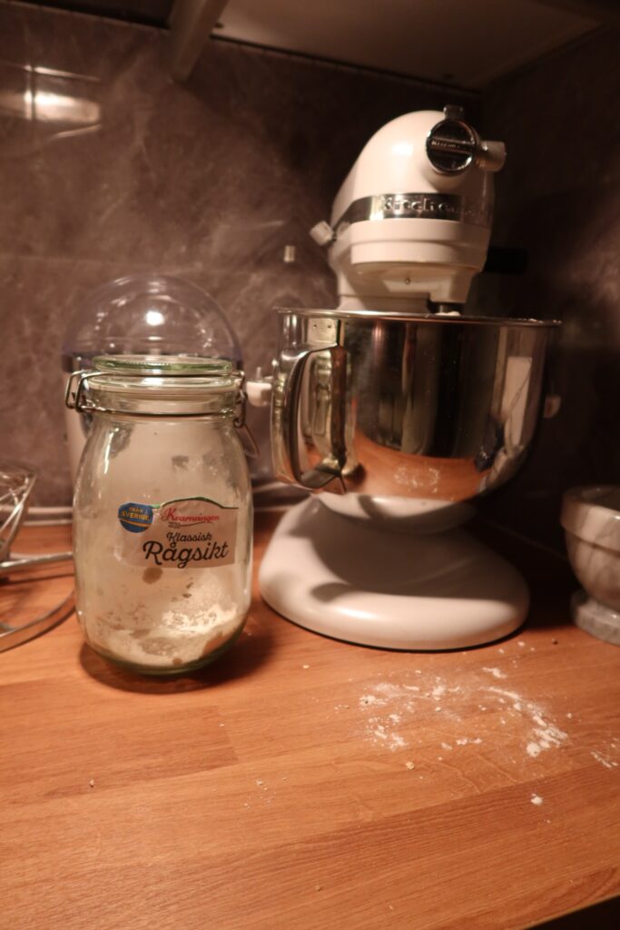 - Häll i havregryn, rågsikt och lite i taget av vetemjölet tills du har en deg som påminner om den jag förklarade här ovan. Var noga med att köra degen i ca 5 minuter om du använder köksassistent, jobbar du degen för hans så knåda i ca 10 minuter. Tänk på att degen blir smidigare av att köra den en stund så du inte har i för mycket vetemjöl från första början.