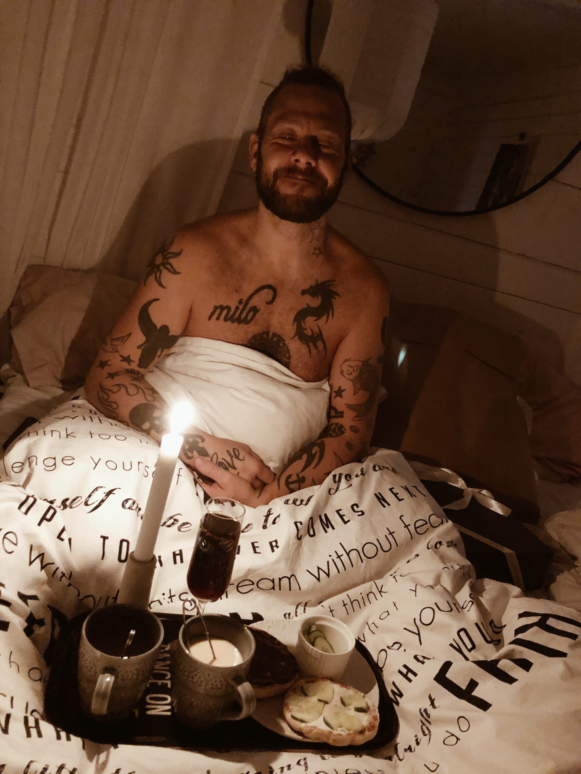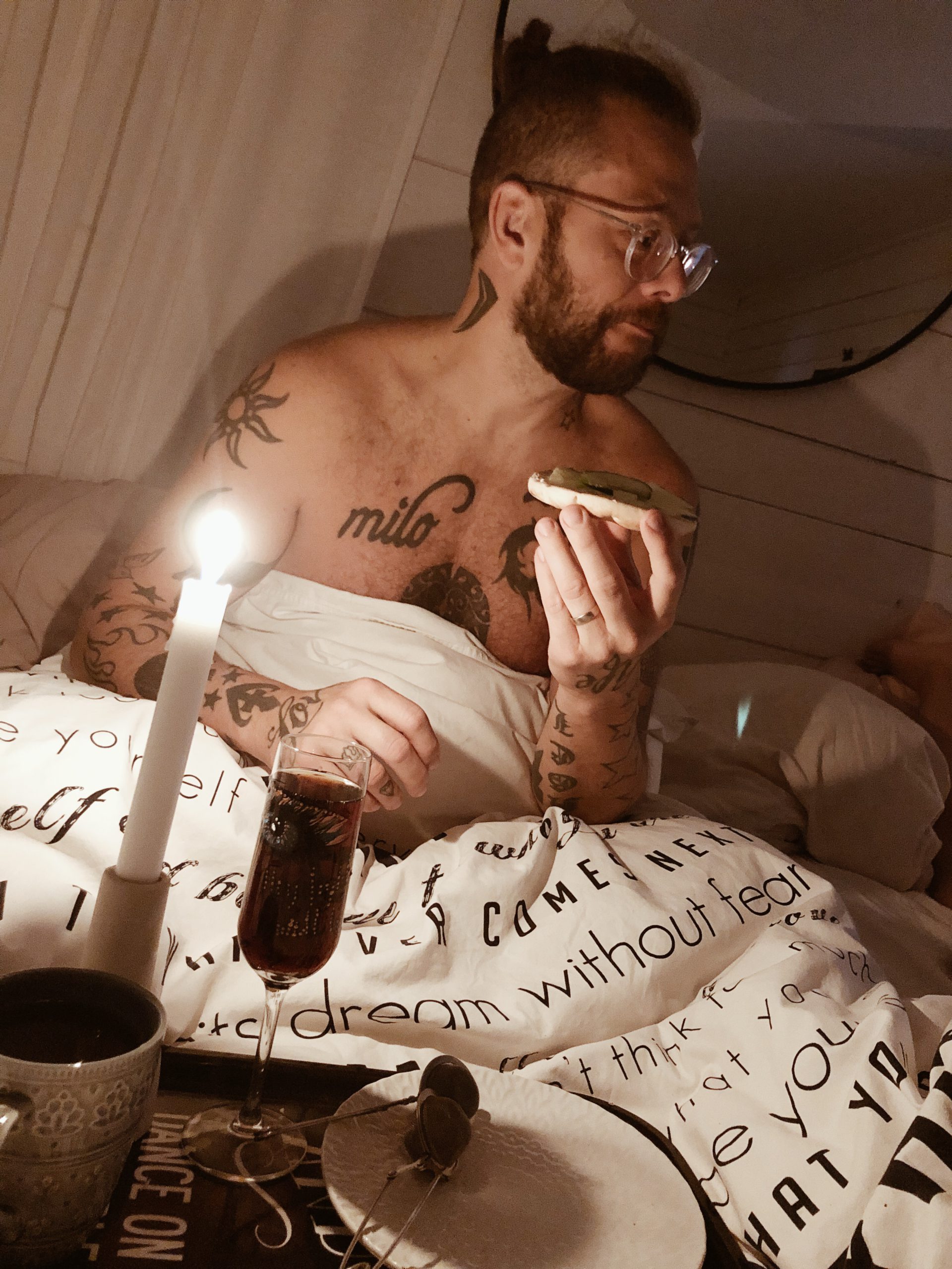 Göra smörgås med cream cheese och gurkhjärtan, kola te och tända ljusen. Sen fick han lite pepsi max till frukost, Tonys craving i livet som jag tjatar om att han ska sluta med alldeles för ofta.