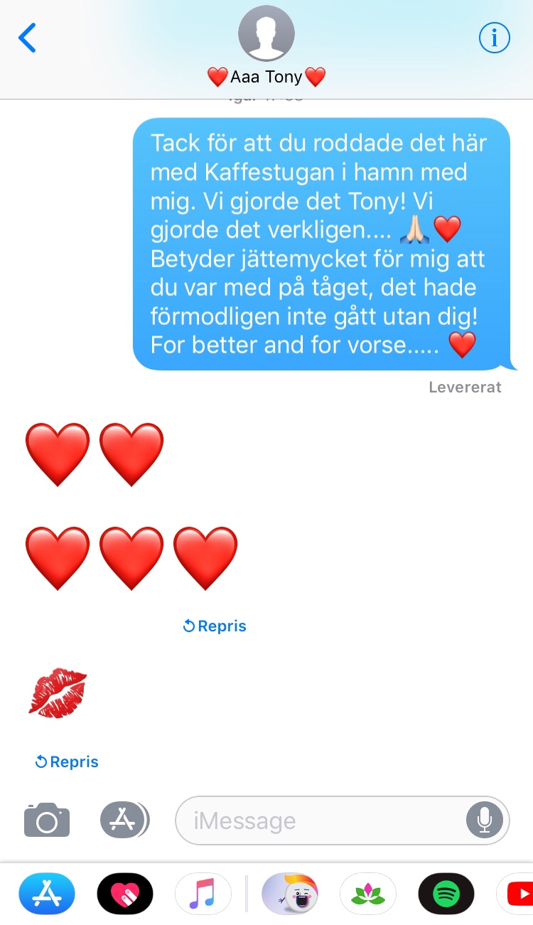 Igår efter att vi stängt igen Kaffestugan och Tony åkte för att hämta mat så skickade jag ett sms till honom. Blev så överväldigad av att vårt cafeäventyr var över.