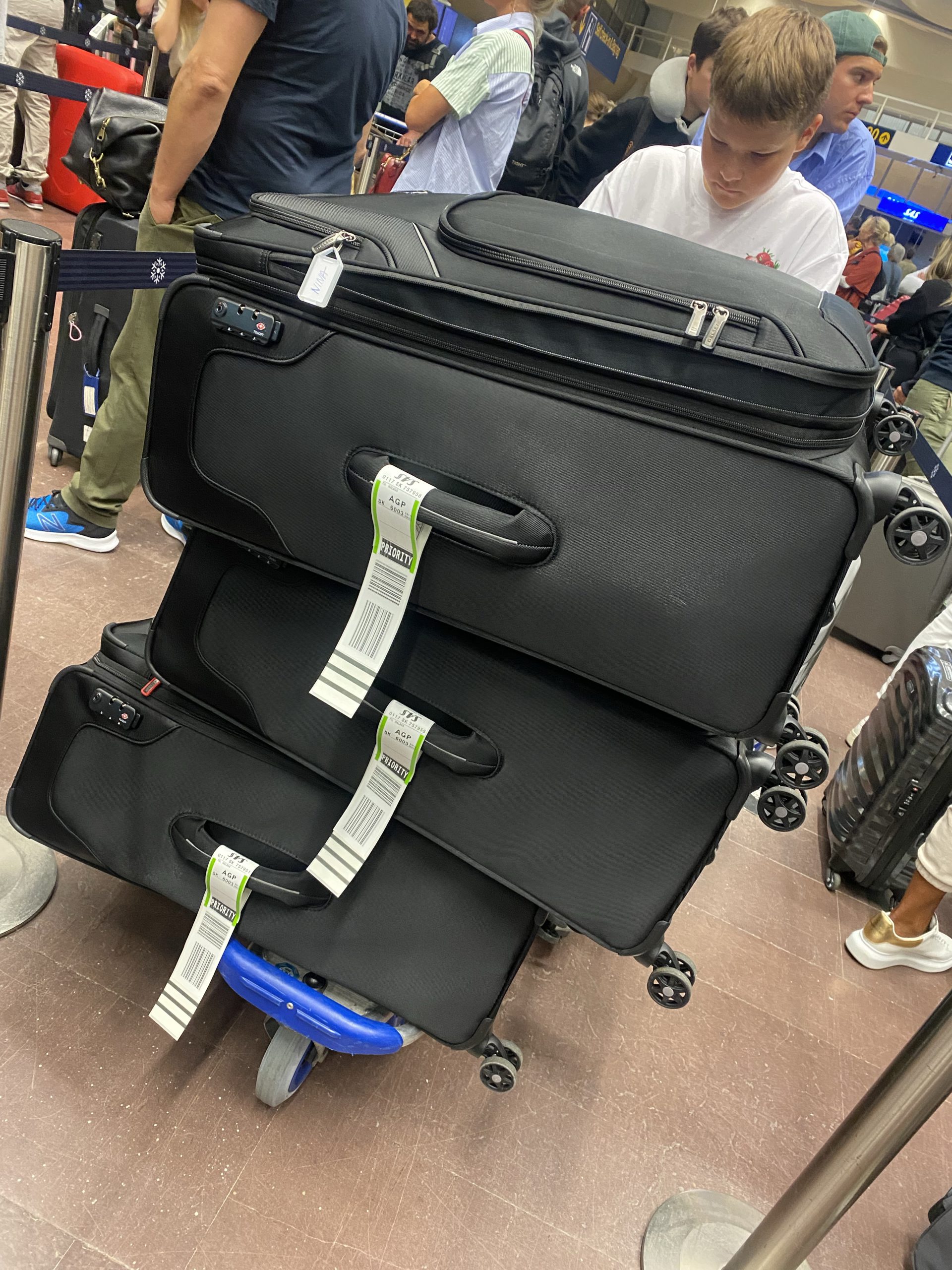 Trötta gänget på väg in för att checka in bagage. Vi fick en hel del övervikt men det var det värt. Haha…. Ska man vara borta länge så ska man.