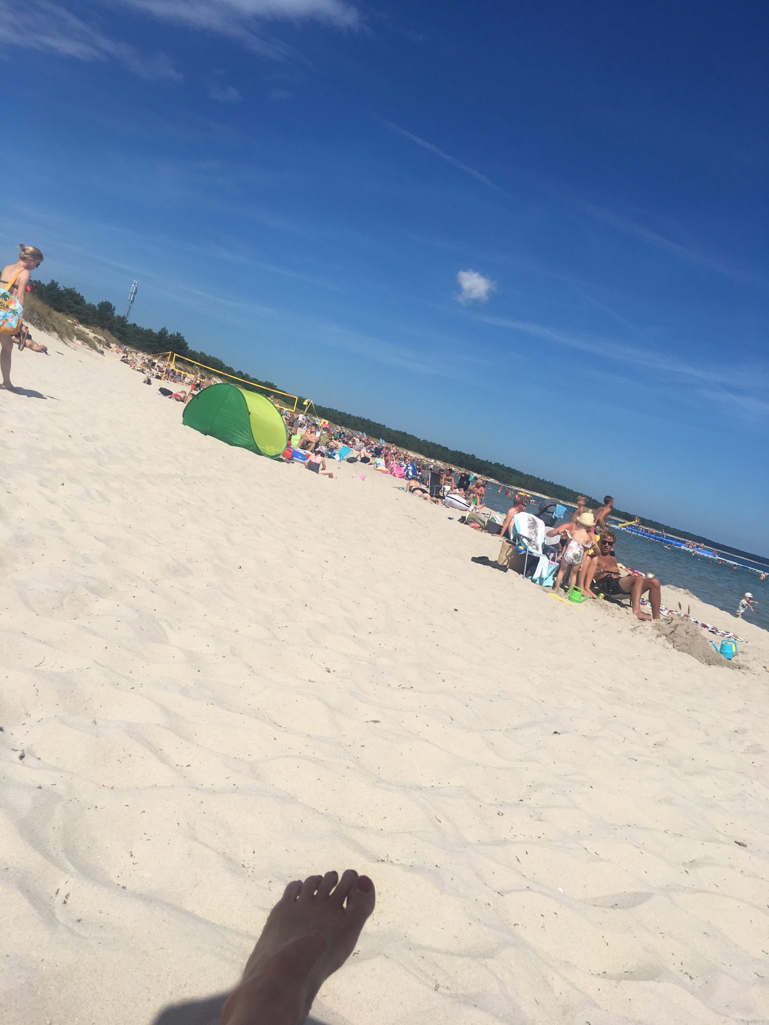 Jag ser hur lycklig Tony är just nu. Det här är livet, det vet jag att han tycker. Han kurrar också högt. Milo badar med sitt nya cyklop. Han har fångat maneter i plastglas och tittat på vita snäckor på botten av det kristallklara vattnet. Familjen är lycklig just nu. I en perfekt värld hade två vuxna barn också legat här bredvid och njutit men jag är lycklig just nu ändå.