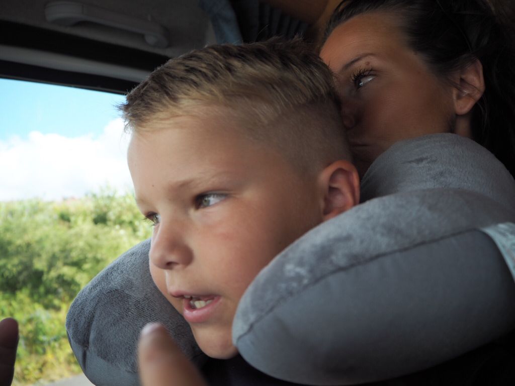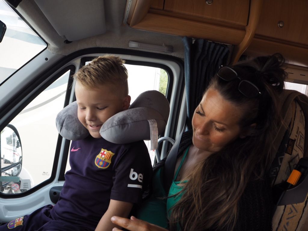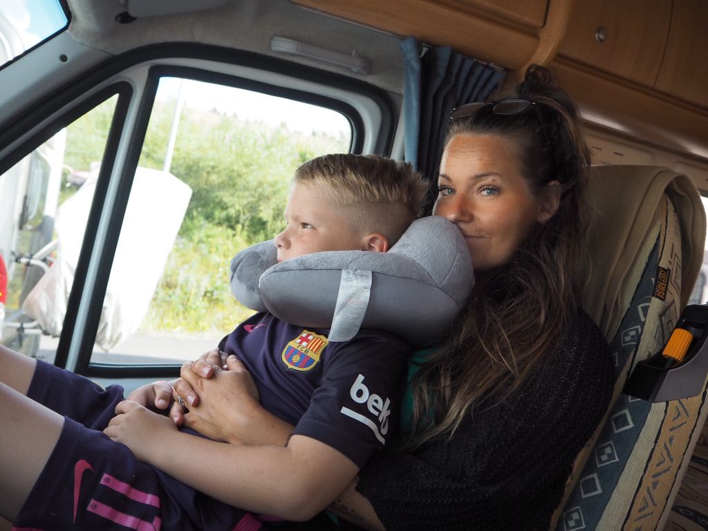 Efter att ha suttit många timmar i sin barnstol och jag kört en massa husbil var det skönt att sätta sig såhär medan vi väntade på att få checka in.