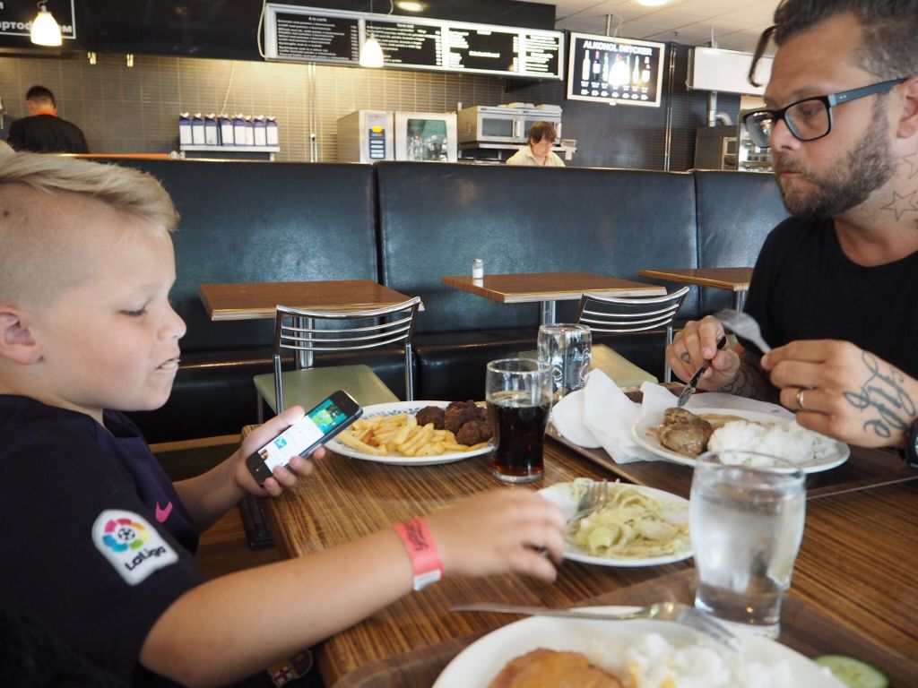 Jag och Milo gick fram till buffén som stod där, vi ville kika vad som fanns. Kvinnan bakom disken tittade på mig och utbrast barskt ”Vi har inga barnportioner i buffén, ni får beställa nåt från tavlan”. Bakom oss ringlade en lång kö varför vi fick ställa oss längst bak i kön igen. Nåväl, jag beställde åt honom och Tony plockade mat från buffén. Han hade tagit glas och tallrikar åt oss alla. Sa att han skulle betala alltihopa till karln i kassan. Då ryckte han i kassan bort tallriken och glaset från brickan och sa att han fick betala för den maten han beställt. Eeeeh….najs!