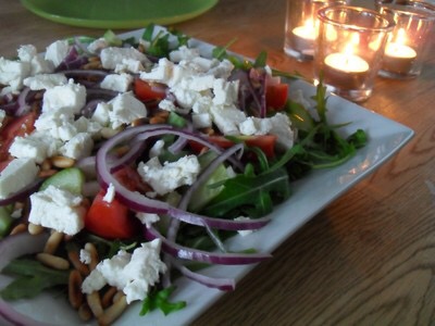 Ruccolabädd, gurka, tomat, rödlök, fårost och rostade pinjenötter. Rostar pinjenötter gör du enkelt själv genom lite olivolja i stekpannan, lite salt och sedan rosta i några minuter eller tills att pinjenötterna får lite färg.