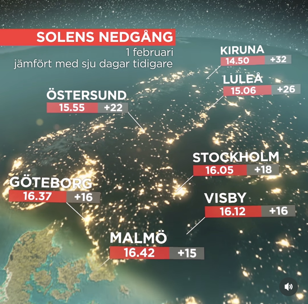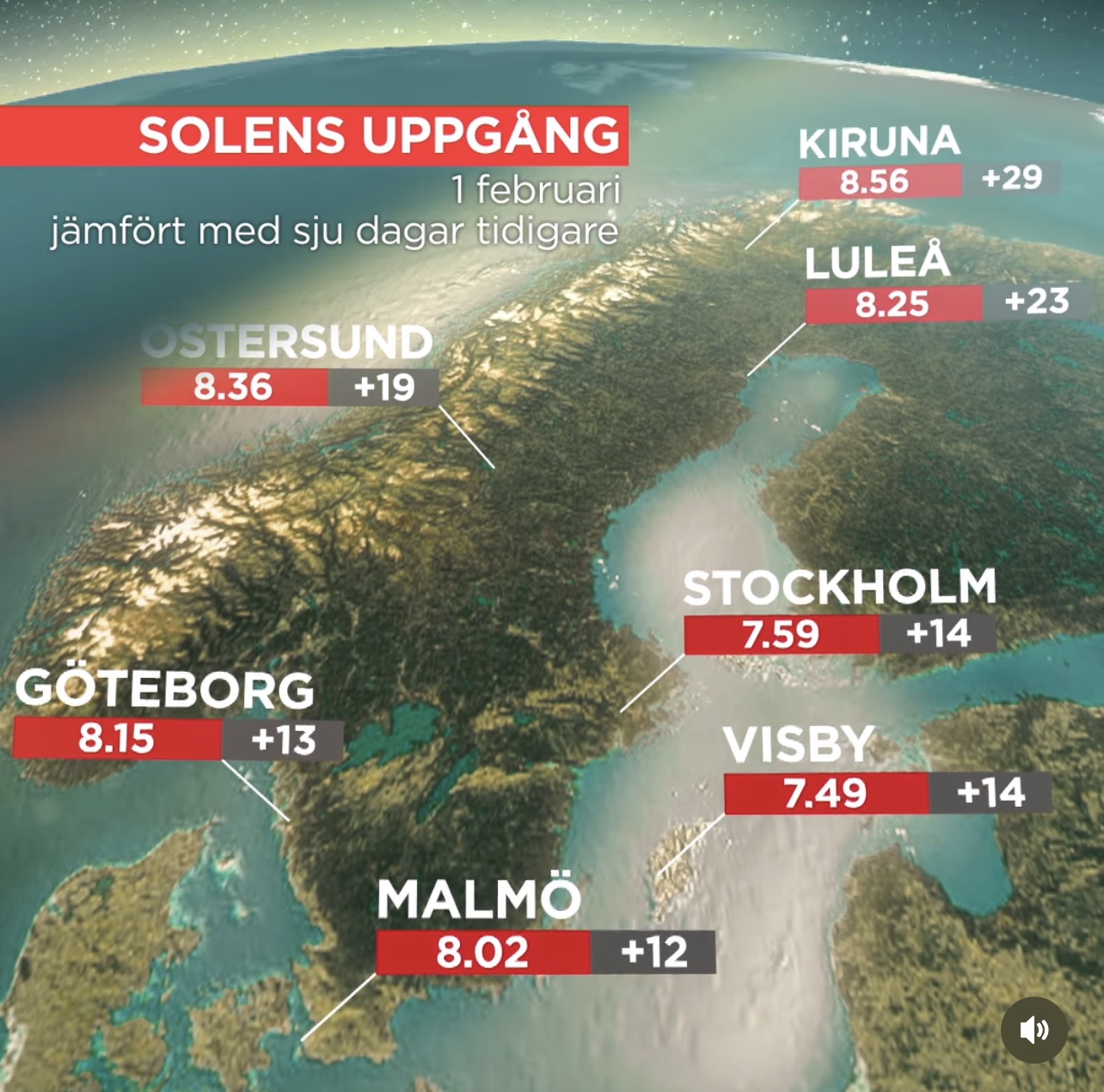 Solens upp och nedgång denna veckan. Jämför med förra veckan så skiljer det en hel del. Siffran i det gråa fältet är skillnaden från förra veckan. En kvart på morgonen och nästan 20 min på kvällen för vår del. Tänk när det är ljust kl 02 när man går upp och kissar. Den tiden är min älsklingstid!