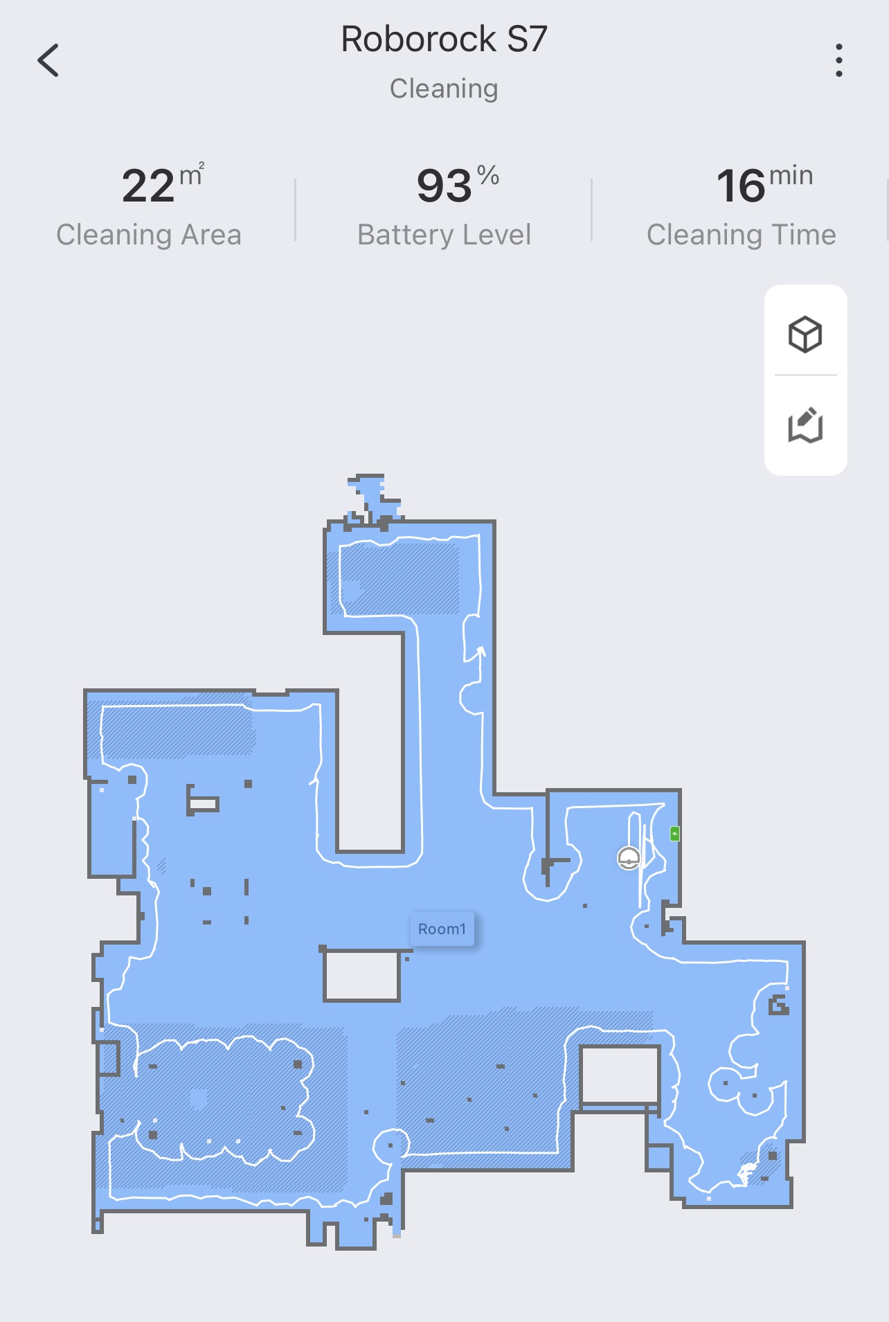 Jag ligger här på soffan och den jobbar. Hör den fara runt här överallt och göra rent. Man laddar hem en app så kan man styra den helt och hållet från den. Idag är tredje gången som den kör så from idag får man börja använda svabbdelen också. Så då ska den torka våra golv också. Nej men detta är ju lyx lyx lyx alltså.