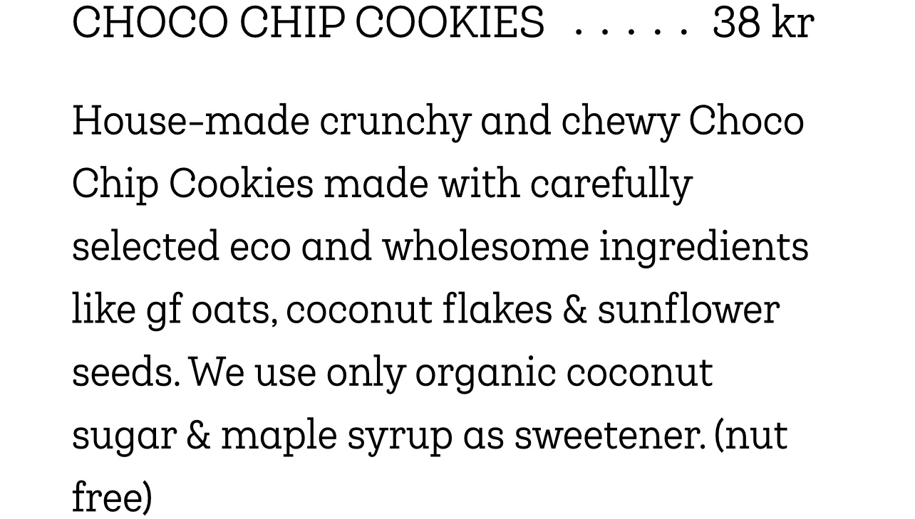 Lunchen med Mellan och att jag fick besöka ett av mina absoluta favoritcafeer i Sthlm. Fern & Fika, du måste testa! Ett veganskt café med antiinflammatorisk mat och fika utan gluten, raffinerat socker och mjölkprotein. För er som inte är så bekanta med veganskt kanske det låter som man äter kvistar och gräs där…. Alltså nej nej nej nej, det finns så mycket gott där så hälften vore nog! Denna gången hann jag inte sitta där och fika, däremot kvistade jag snabbt in för att köpa kakor. Deras CHOCO CHIP COOKIES är ”to die for”. Nej men jag är så lycklig att jag har 5 1/2 i skafferiet (har redan ätit 1 1/2) och ska få mumsa på en idag igen. Grejen är att min kropp (med IBS) mår bäst när jag äter mjölkfritt utan gluten typ. Nu lever inte jag så jämt utan jag svävar ut både här och där (balans) och det klarar jag (läs magen) rätt bra. Men när jag hittade det här cafet så kände jag att jag kunde gotta mig gränslöst åt allt utan att behöva tänka ”jag kan inte äta så mycket” osv. Här kan jag smälla i mig 4 kakor om jag vill, inga problem! Haha…. Du kommer aldrig orka äta 4 såna här kakor för dom är gigantiskas men ändå. Så tips tips! Besök, men spara några choco chip cookies till mig. Tipsar också om deras choco coconut brownie, amerikanska pannkakor, cheesecake Apple/Vanilla och semlor om dom finns. Mums!