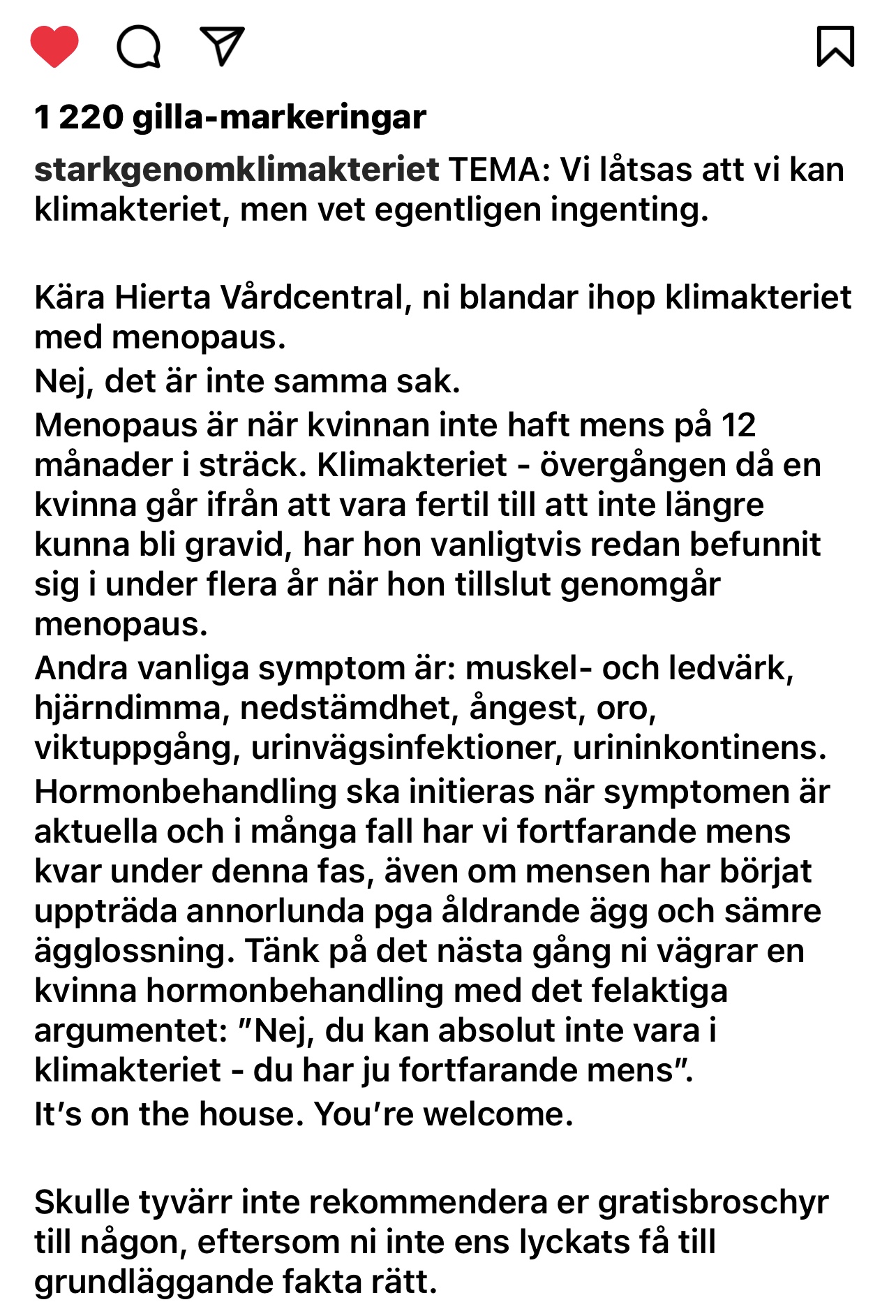 Har haft lite strul med att hitta rätt dosering av min progesteronkräm så klimakteriet slog till som ett jäkla blixtnedslag i veckan. Hade t.o.m. panikångestkänslor vilket jag inte haft på åratal. Det sjuka är att samma dag som jag haft det så skrev en följare om sitt klimakterie och att hon t.o.m. hade fått panikångestkänslor. Det var en lättnad för mig, då känner man sig normal i det onormala. Kan verkligen varmt tipsa dig om att följa kontot: ”Stark genom klimakteriet”, Instagram HÄR. Bilderna här ovan förklarar kvinnohälsan som råder just nu så himla bra. Hämtat väldigt mycket kraft och tips från hennes sida. Det har t ex blivit dag för mig att kolla hur jag ligger till i mitt klimakterie nu, förmodligen behöva även östrogen nu. Fortsättning angående det följer….