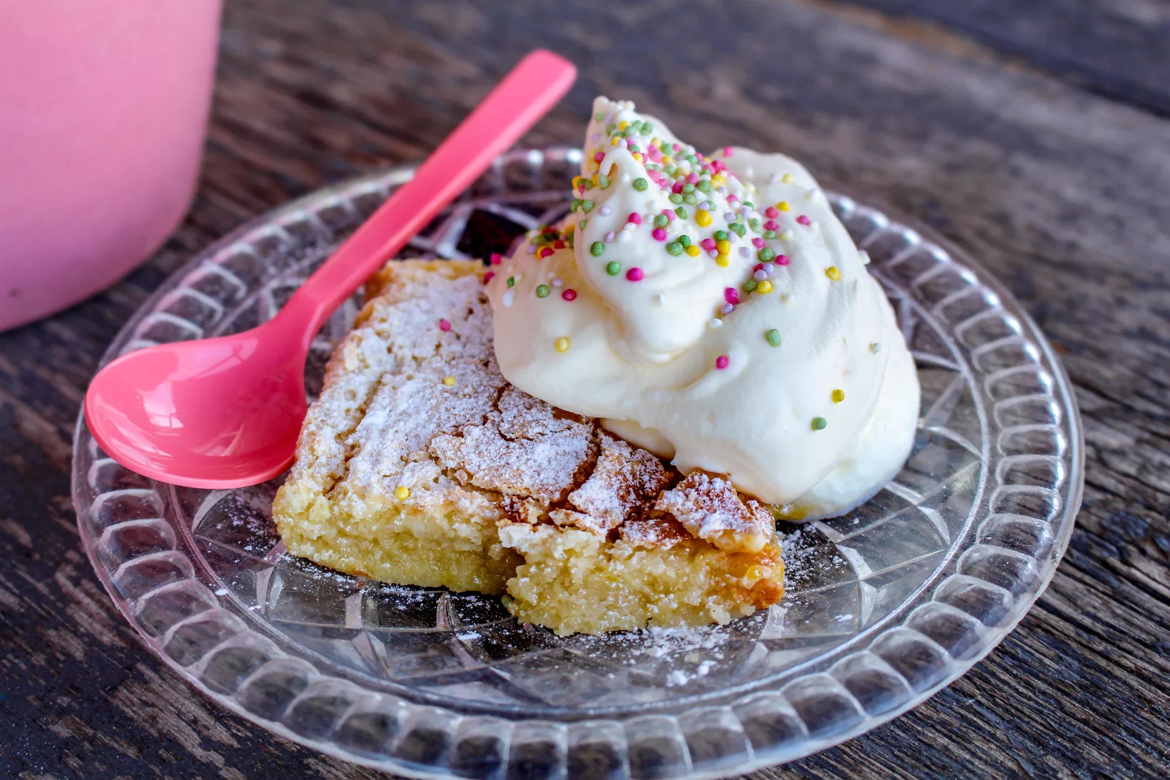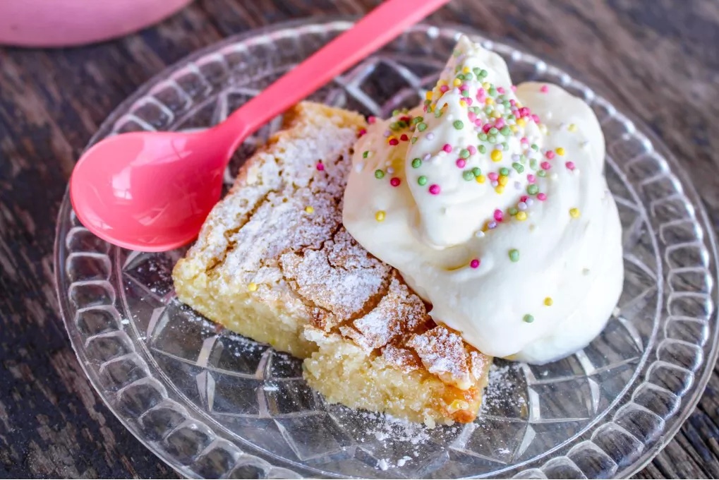 3) Citronkräm: Vispa ägg och socker riktigt pösigt. Ha i alla de torra ingredienserna och blanda till en jämn smet. Ta ut kakan och häll över smeten över kakan. Grädda i ytterligare 15-20 min, kolla bara så kakan inte bränns uppepå. Kakan är lite lös så låt den svalna helt när du tar ut den. Pudra med florsocker och servera till lättvispad grädde och kanske lite strössel.