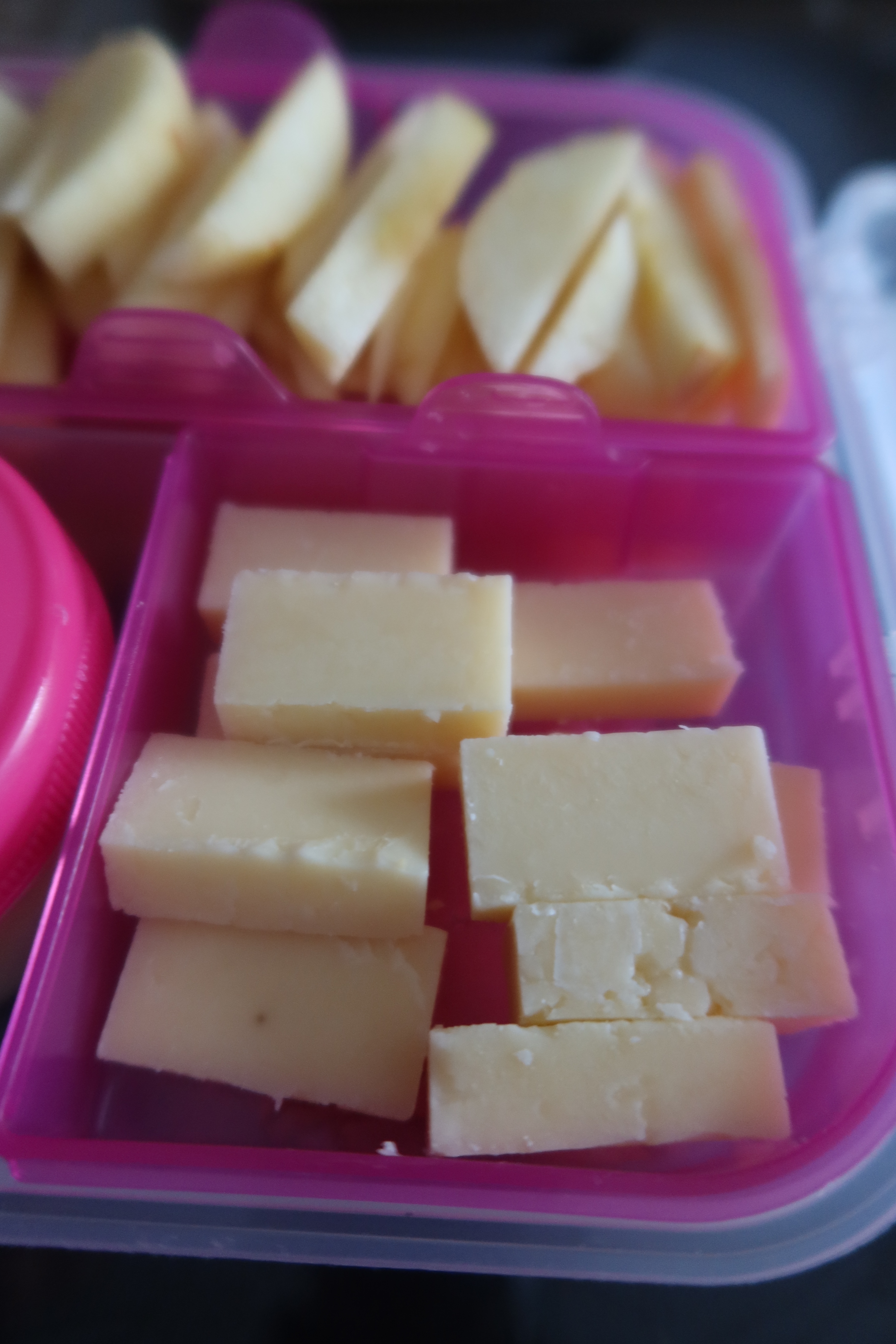 Den här beställde jag på Amazon. I den här Mellisbehållaren hade jag i äpple- och morotsstavar med en hemgjord dipp på yoghurt, sweetchilisås, vitlökspulver och salt. Sen hade jag i ostkuber och skinkbitar också.