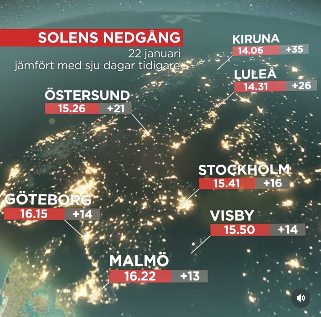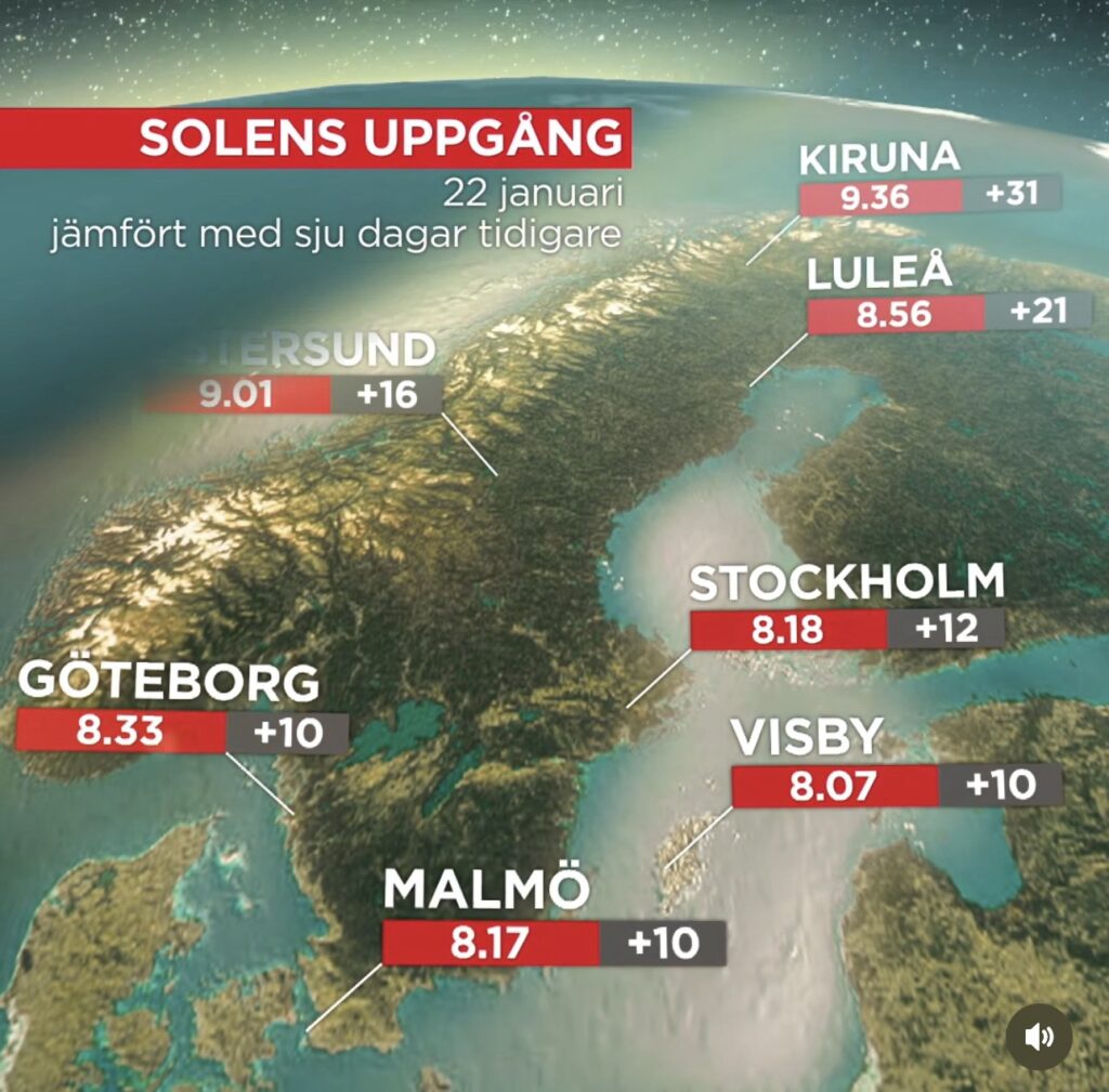 Det här gör mig glad! Att vi dundrar på mot ljuset, min enda räddning nu faktiskt för fyyy tusan vad deppigt det är med mörkret nu när snön försvann och det faktiskt bara regnar här. Som en enda hemsk höst ju. Så det här gör mig glad, solfilmen… bara sedan förra veckan så går solen ned 16 minuter senare. Och upp 12 minuter tidigare. Kolla uppe i Kiruna, där går det i raketfart nu. Unnar dom det, så mörkt som dom haft det hela vintern. Är ju uppvuxen med jularna uppe hos mormor och hon bor i Finland i höjd med Kiruna så jag exakt hur mörkt det är.