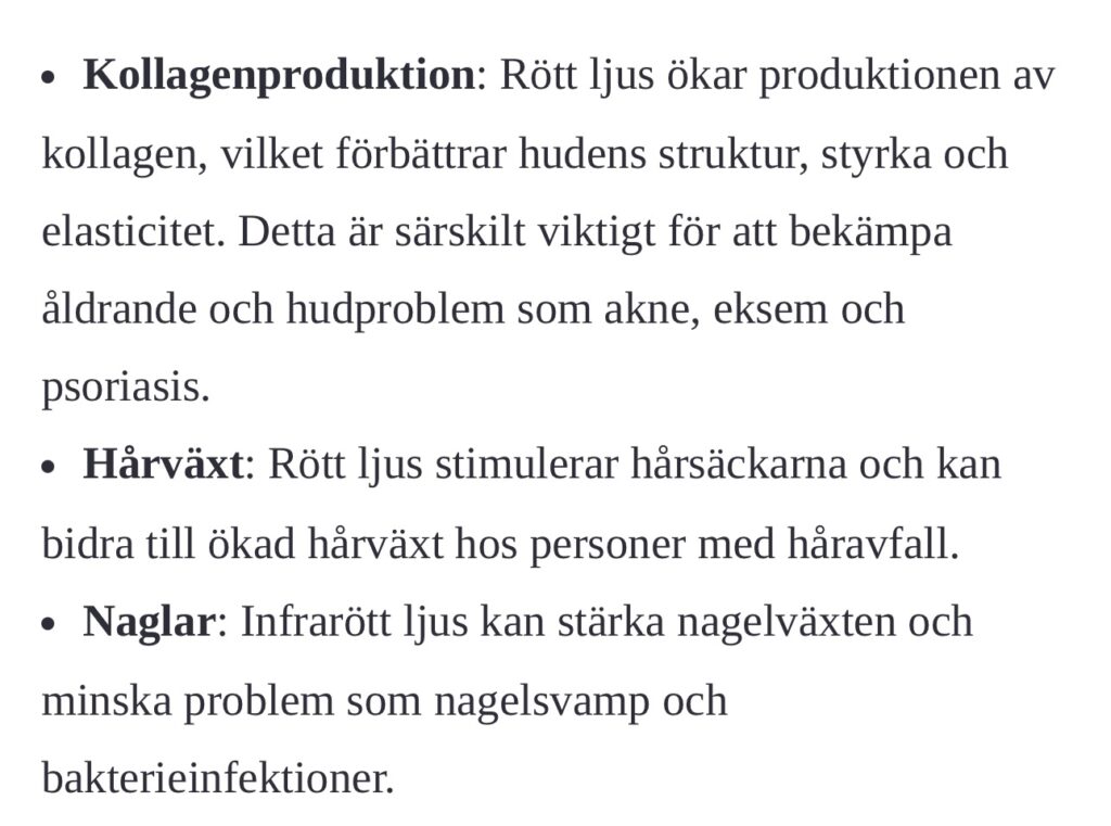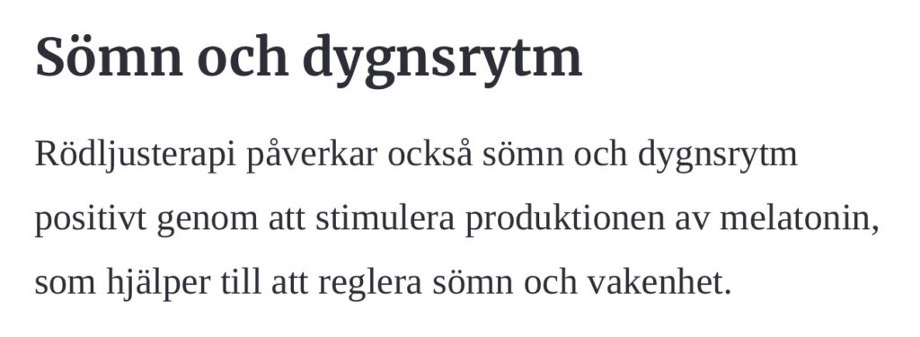 Vidare skriver det att rött ljus även förbättrar hjärnhälsa, kognitiv funktion, prestation och återhämtning, förbättrar ledvärk och benhälsa och ögonhälsa.