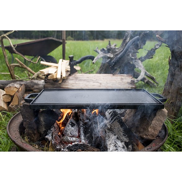 Den här stekhällen är perfekt, bra pris och vändbar. Perfekt att använda rakt på elden. En räfflad grillsida och en slät. Det fiffiga är att den också kan användas på induktionshällen därhemma.