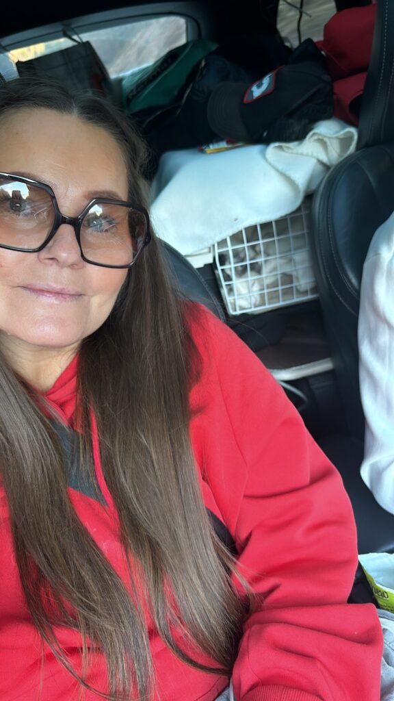 Såhär satt jag igår, jag hann påbörja det här inlägget. Var tvungen att hålla koll på trafiken och allt runtom då det ju blåste huggormar och drivis omkring oss. 😅 Det är stormen Jesper, eller vad hette han? Det hade blåst ned träd och grejer på vägarna.