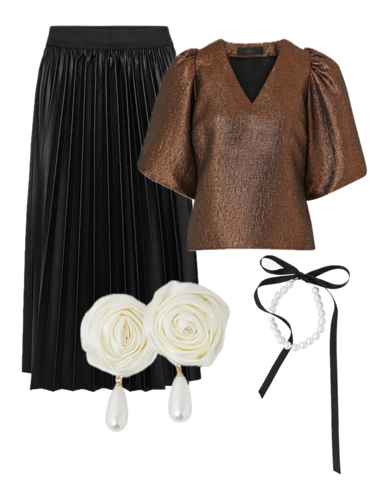 Plisserad kjol i skinnimitation // Supersnygg blus (rea) // Armband med rosett // Urfina örhängen