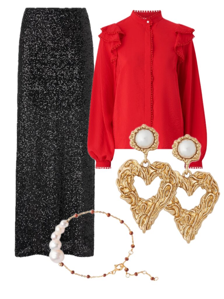 Maxikjol // Röd blus // Örhängen // Armband