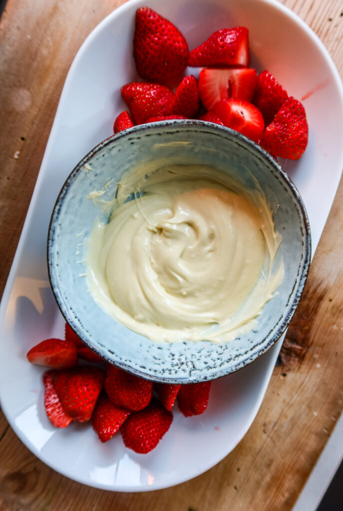 Jag blev nyss serverad detta vid sängen, lite gottigt mellanmål nu när den här dagen inte riktigt blev som tänkt. I skålen är det smält vit choklad.