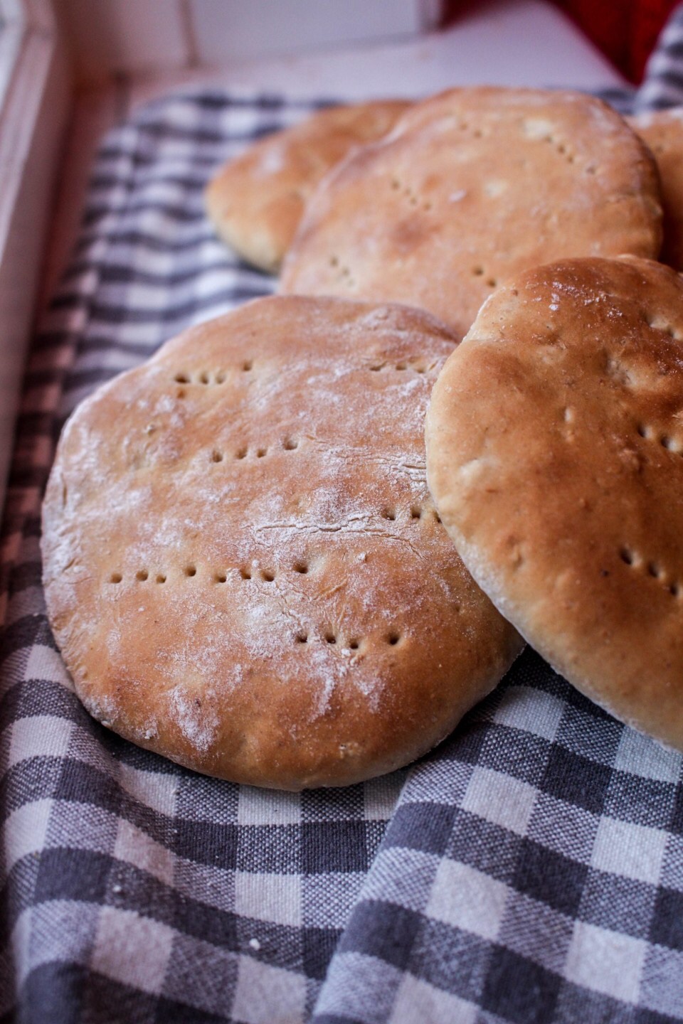 3) Mjöla bakbordet. Dela degen i 2 och kavla ut varje till en platta på ca 1 cm hög.