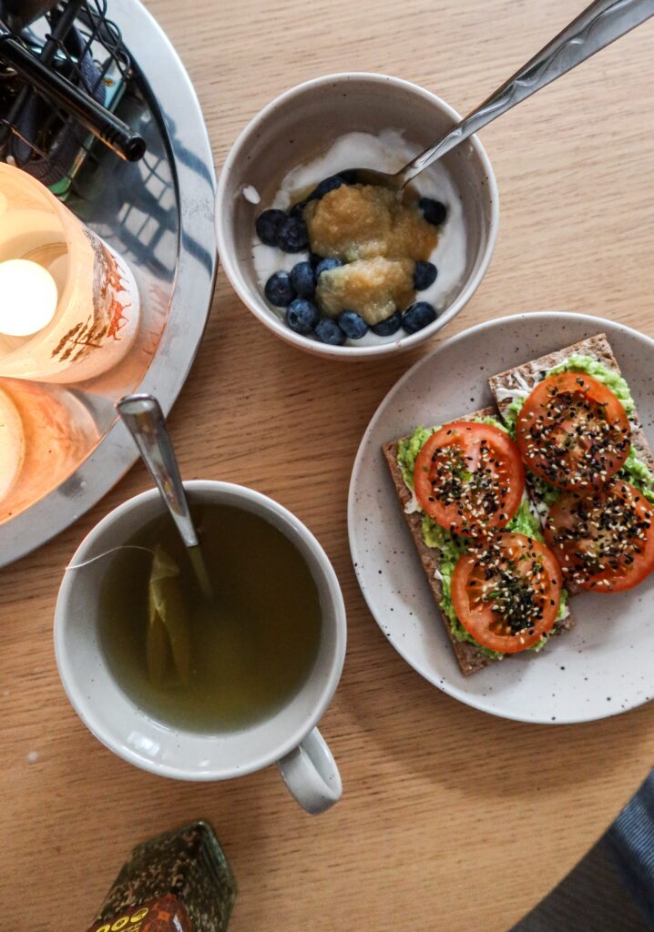 Från frukosten i morse, kokosyoggi med osötad äpplemos och blåbär. Till det 2 glutenfria knäckemackor med avokado & tomat och min craving just nu, furikake. Sååå smaskigt!