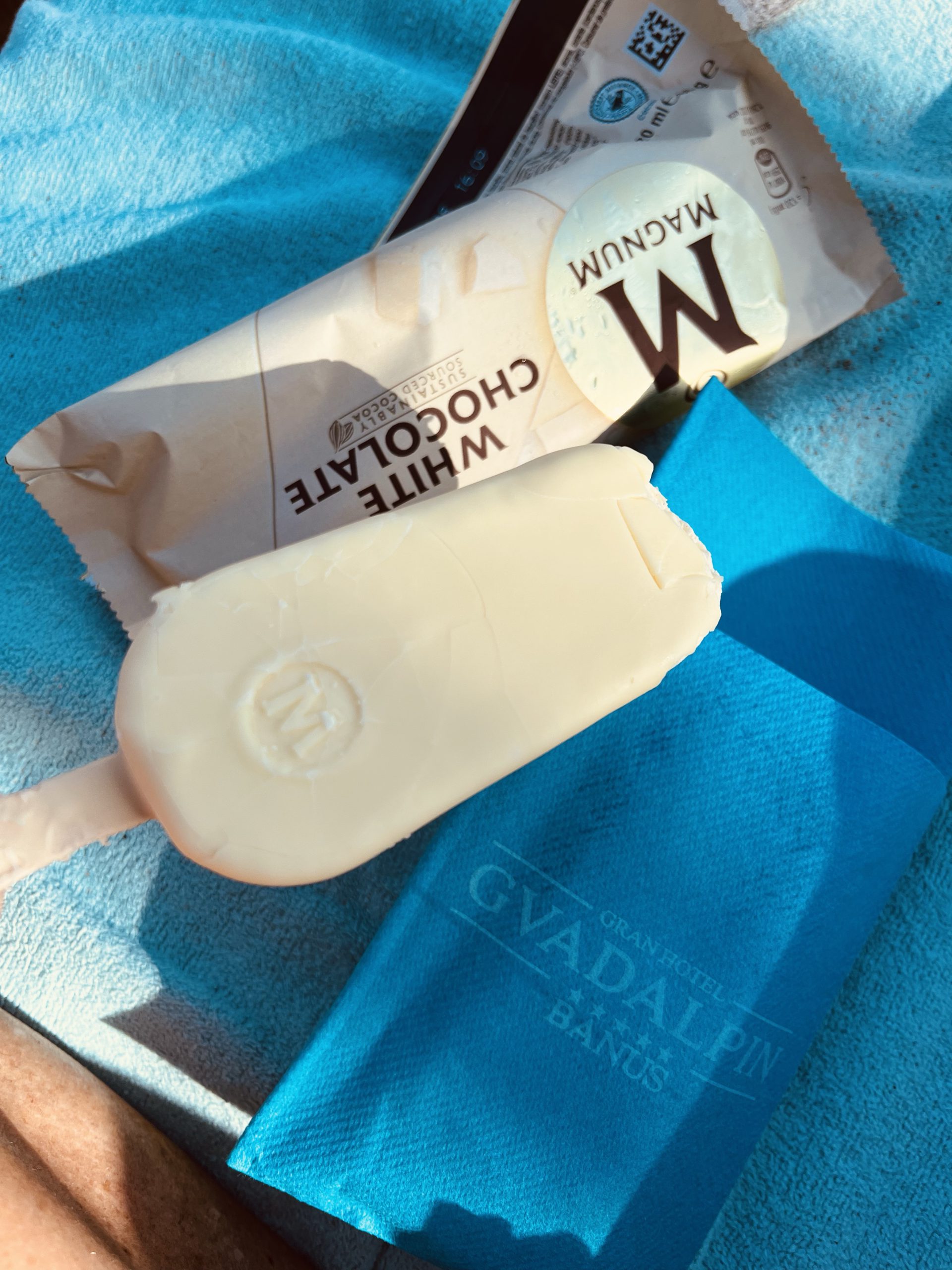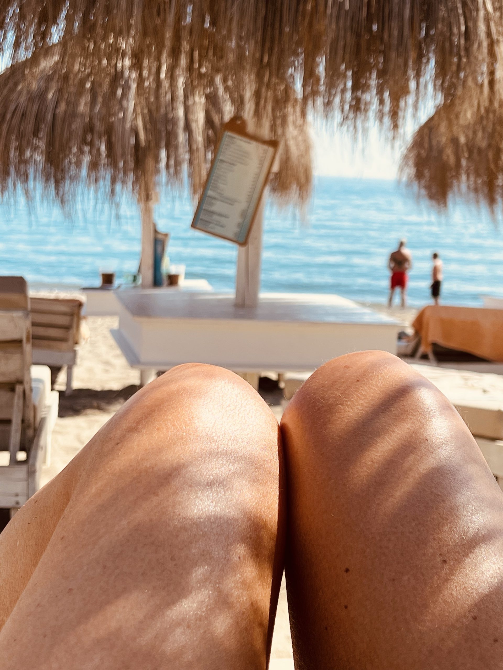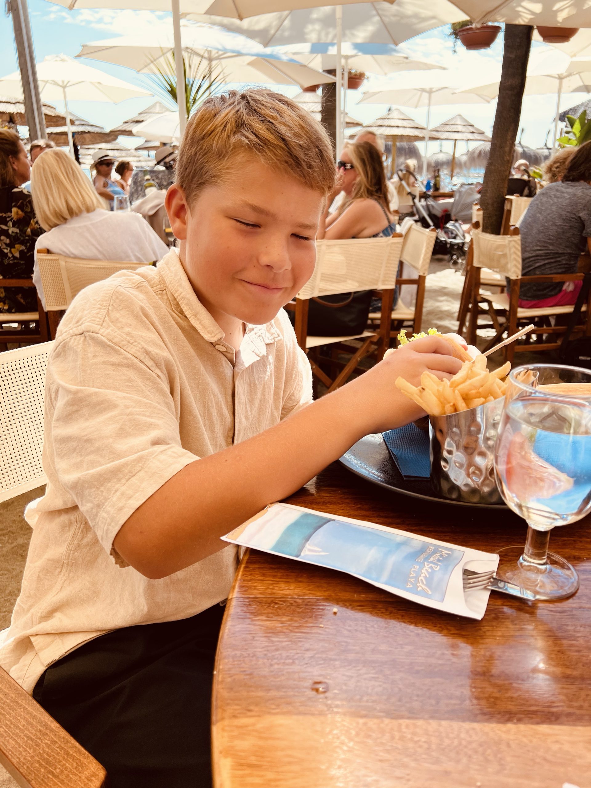 Det var nästintill fullt på Mistrals beachclubs solstolar så vi gick vidare till lyxhotellets. Satte ju nästan gambasräkorna i fel strupe när han berättade att dessa solstolar skulle kosta 250 kr/st fast klockan var så pass sent ändå. (Tror klockan var vid 15.30). Men, vi orkade inte gå så långt till nästa solställe så vi betalade snällt. I priset ingick stor bad handduk, fruktskål och en stor bubbelvatten. Det var ju faktiskt mer generöst än på Mistral där det bara var stolarna och inget annat som kostade så. Vi njöt för fulla muggar. Milo & Tony badade lite och jag låg och bara glodde. Låg lite i solen faktiskt och det var så skönt den tiden. Vi blev kvar ända till 19 innan vi sakta packade ihop oss och gick mot bilen.