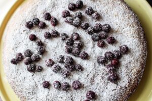 7. Grädda i nedre delen av ugnen i 175 grader, ca 15-20 minuter. Låt den gärna sätta sig lite i kylen. Strö på några blåbär och pudra sedan över florsocker strax innan servering
