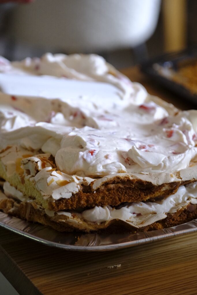 10. Grädda mitt i ugnen ca 25–30 min, tills marängen är gyllene. Låt svalna helt.