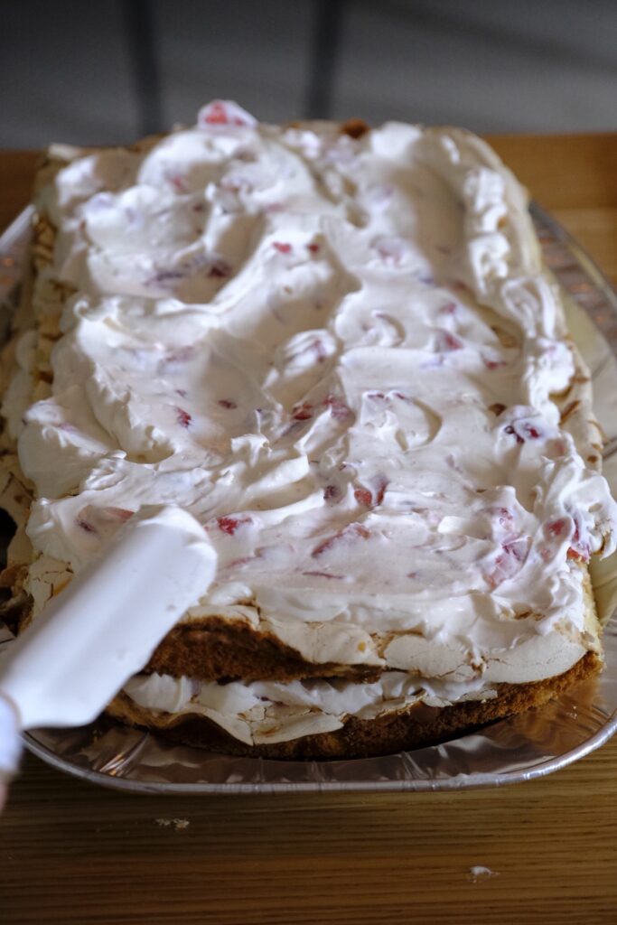 • Bred ut hälften av jordgubbsfluffet. Lägg på den andra botten (också med marängsidan upp).