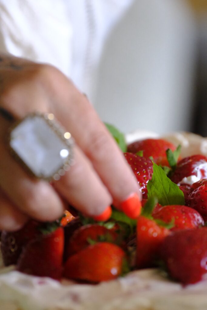 3. Dela jordgubbarna i mindre bitar.