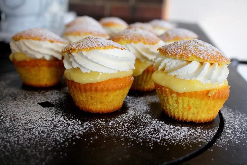 6) Låt muffinsen svalna helt. Skär av toppen på muffinsen och fyll sedan med vaniljkräm och vispad grädde. ÄT OCH NJUT!