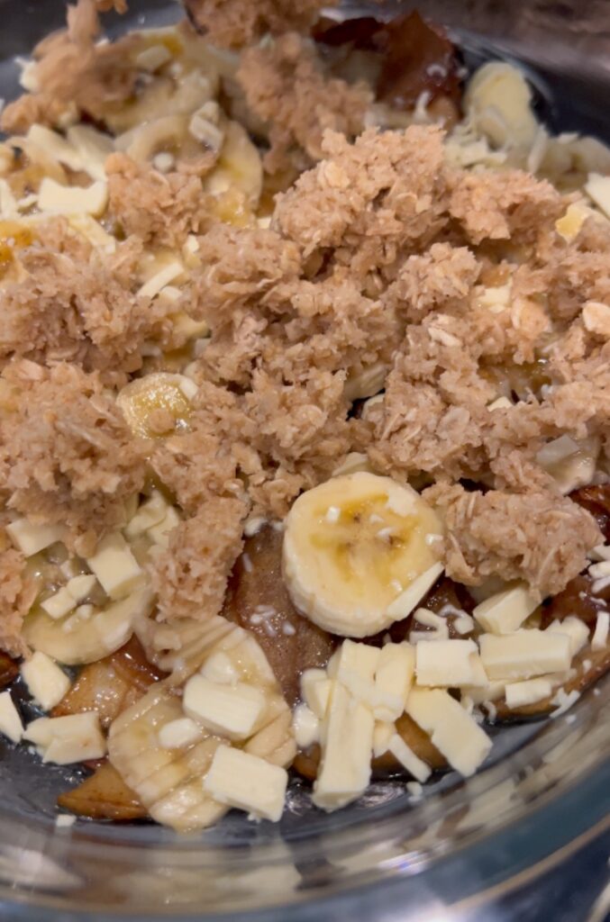 Letar du efter det perfekta receptet på äppelpaj? Denna äppelpaj med banan och vit choklad är en oemotståndlig kombination av söta och syrliga smaker som kommer att förgylla vilken efterrättstillställning som helst. Med en krispig smuldeg gjord på havregryn och en fyllning av stekta äpplen, banan, och vit choklad, är det här en efterrätt som kommer älskas av alla, tror mig.