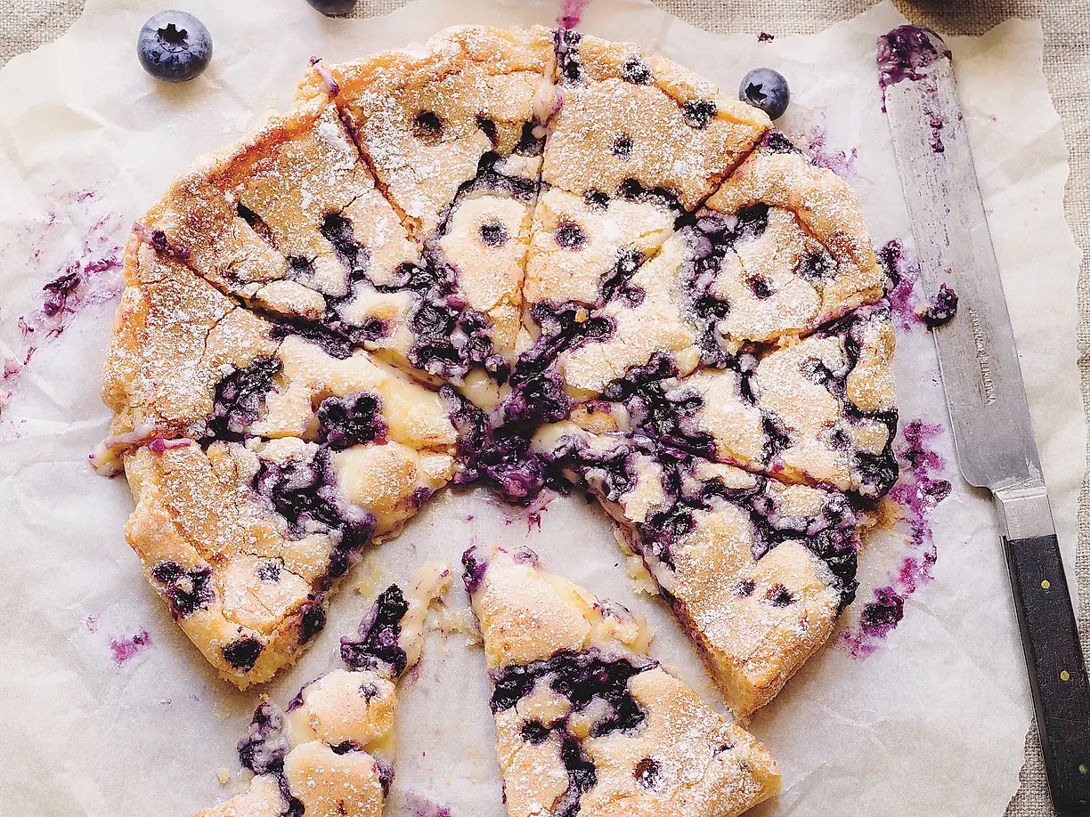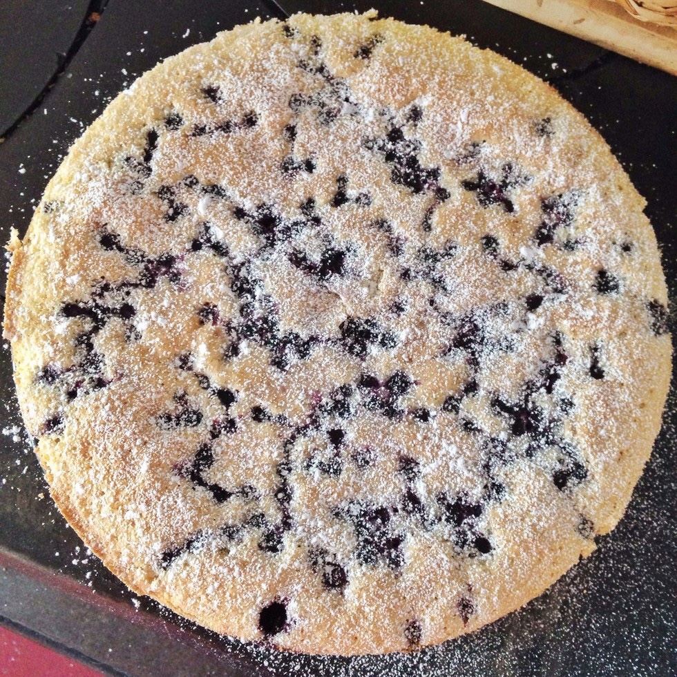 4) Fördela smeten jämnt i formen och strö över blåbären. Grädda mitt i ugnen i 15–25 minuter. Den kortare tiden ger en extra kladdig kaka, ungefär som den på bilden. Ett bra riktmärke då är att kakan ska vara dallrig i mitten. Låt gärna kakan svalna helt i kylen, om tid finns.