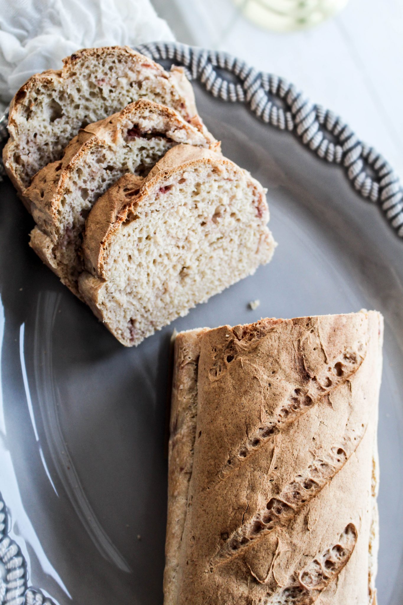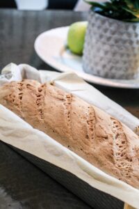 3) Klä en avlång brödform med bakplåtspapper och häll i degen där. Låt jäsa i ca 45 minuter. Skär några snitt i brödet. Grädda på 225 grader i ca 40 minuter, blir det för mörkt ovanpå kan du täcka med lite folie. Brödet ska hålla en temp på ca 94 grader invändigt. Låt stå och svalna en stund innan du skär upp det.