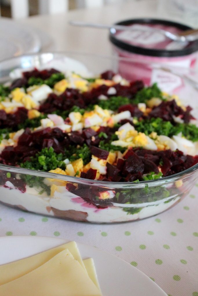 2. Bred ut den i botten på en form. Lägg sedan rader av hackat ägg (1 st), rödbetor och gräslök (går också fint att byta ut mot persilja eller dill) uppepå. Busenkelt!