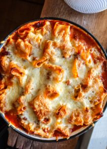 5. Häll pastan i en ugnsfast form, häll i köttfärssåsen, på med riven ost.