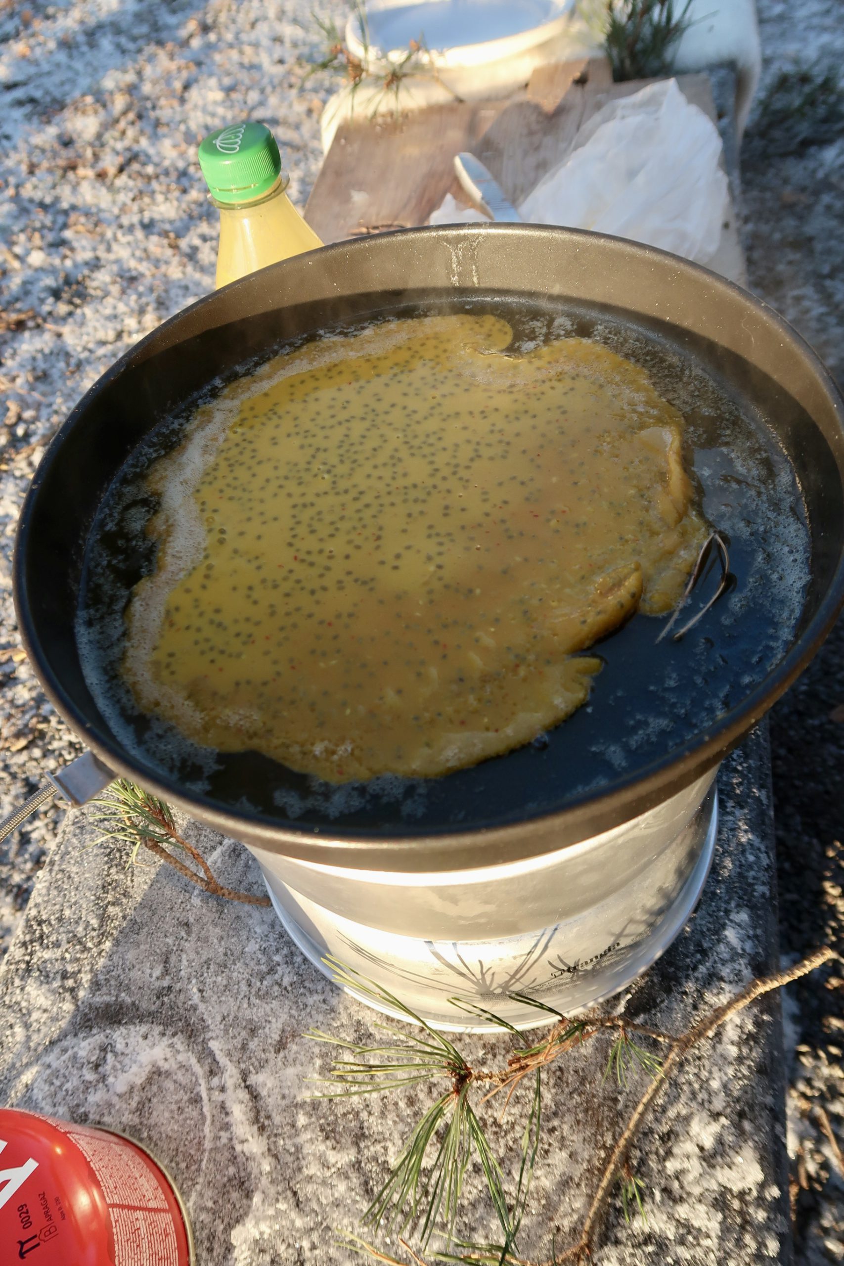 Tonys första lagg…. Glömde dock att vi hade florsocker med oss. Haha, blev ju både godare och vackrare med lite florsocker uppepå. Men helt klart godaste saffranspannkakorna man kan äta!