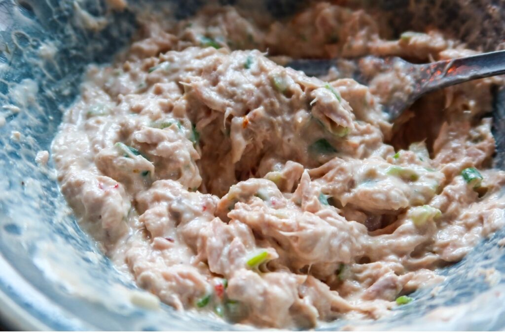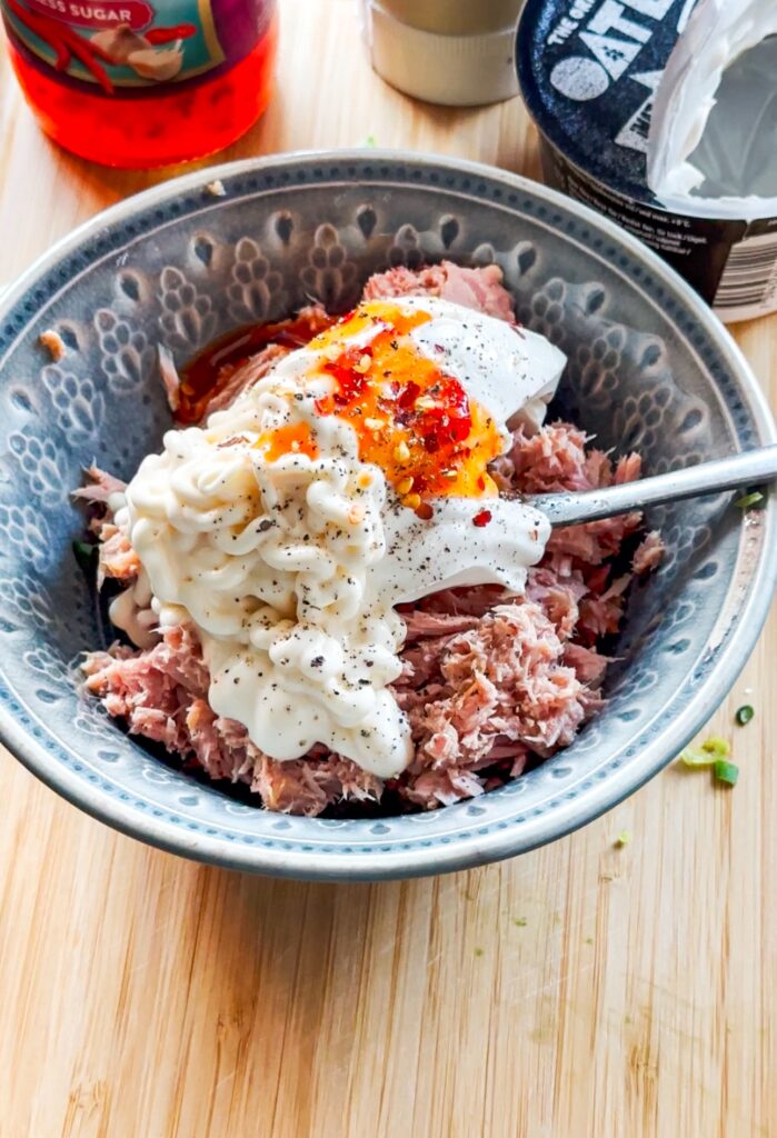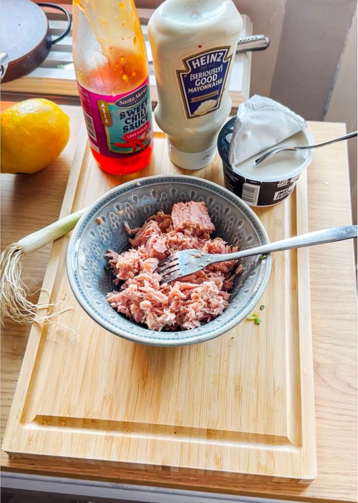 1. Ha i tonfisken i en skål. Hacka salladslöken och ha i den skålen.