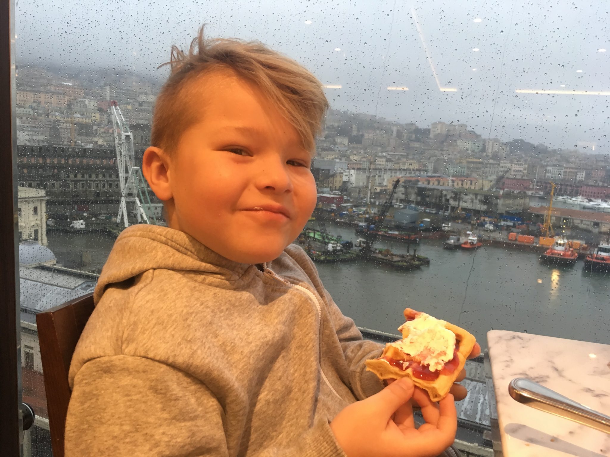 Vi började med frukost. Milo åt sin favvo, croissanter och våfflor med sylt och grädde.
