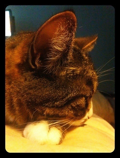 Nästan varje morgon kommer vår 10 kilos katt och lägger sig på min mage. Det ska spinnas, klias och klappas. Varje morgon är jag lika kissnödig när han väljer att ligga på kissblåsan. Men så vill jag inte gå upp eftersom han har det så mysigt. Så här ligger jag och liiiider och kissblåsan värker. Ni som gillar katter förstår mig, ni som inte gör det måste tycka att jag är en mupp!
