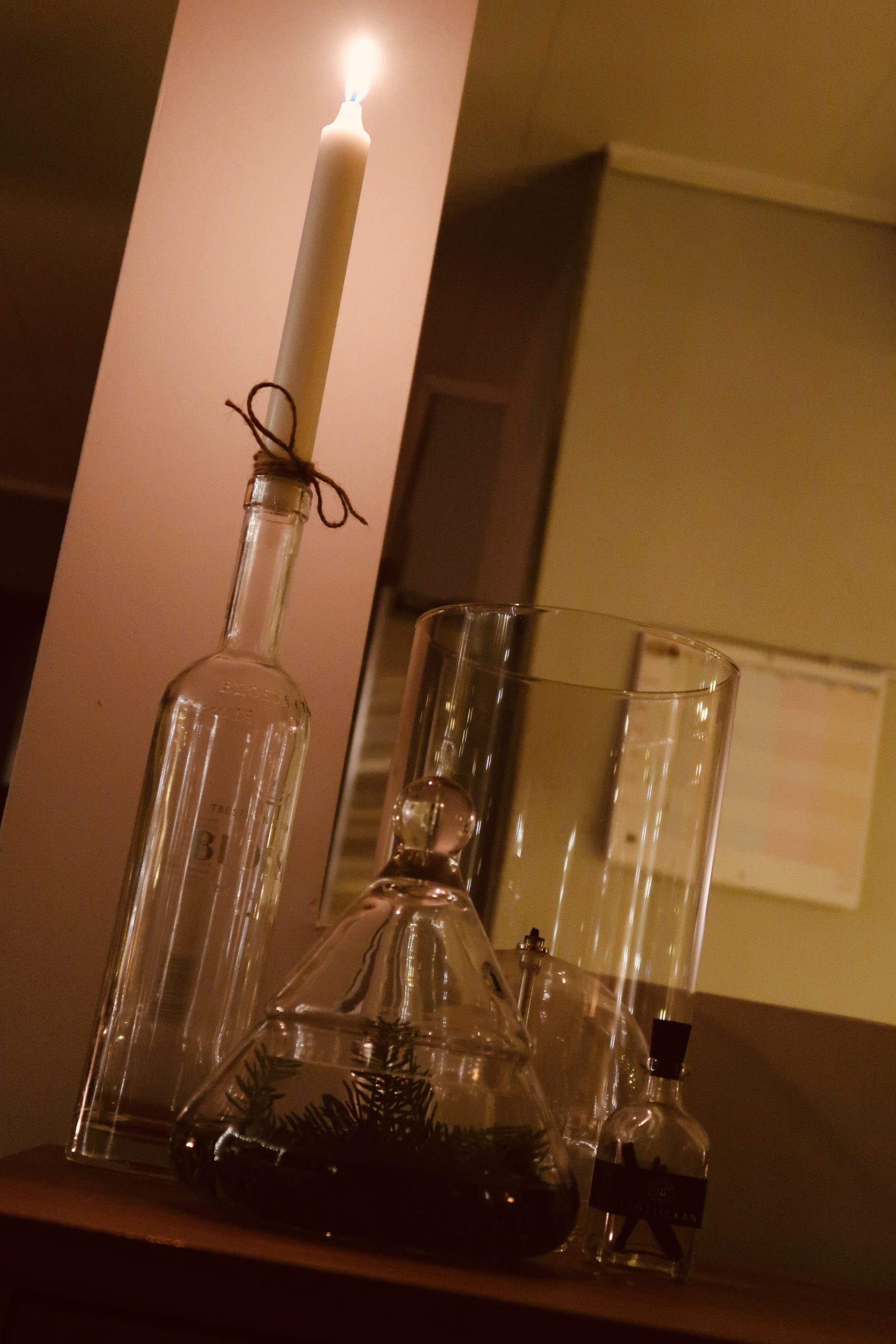 Sparade vår glöggflaska till en ljusstake. Jag som älskar grankvistar ska hämta en liten grankvist som jag ska stoppa ned i flaskan i lite vatten. Så fint! Har redan står lite i den lilla glasgranen på skåpet i vardagsrummet.