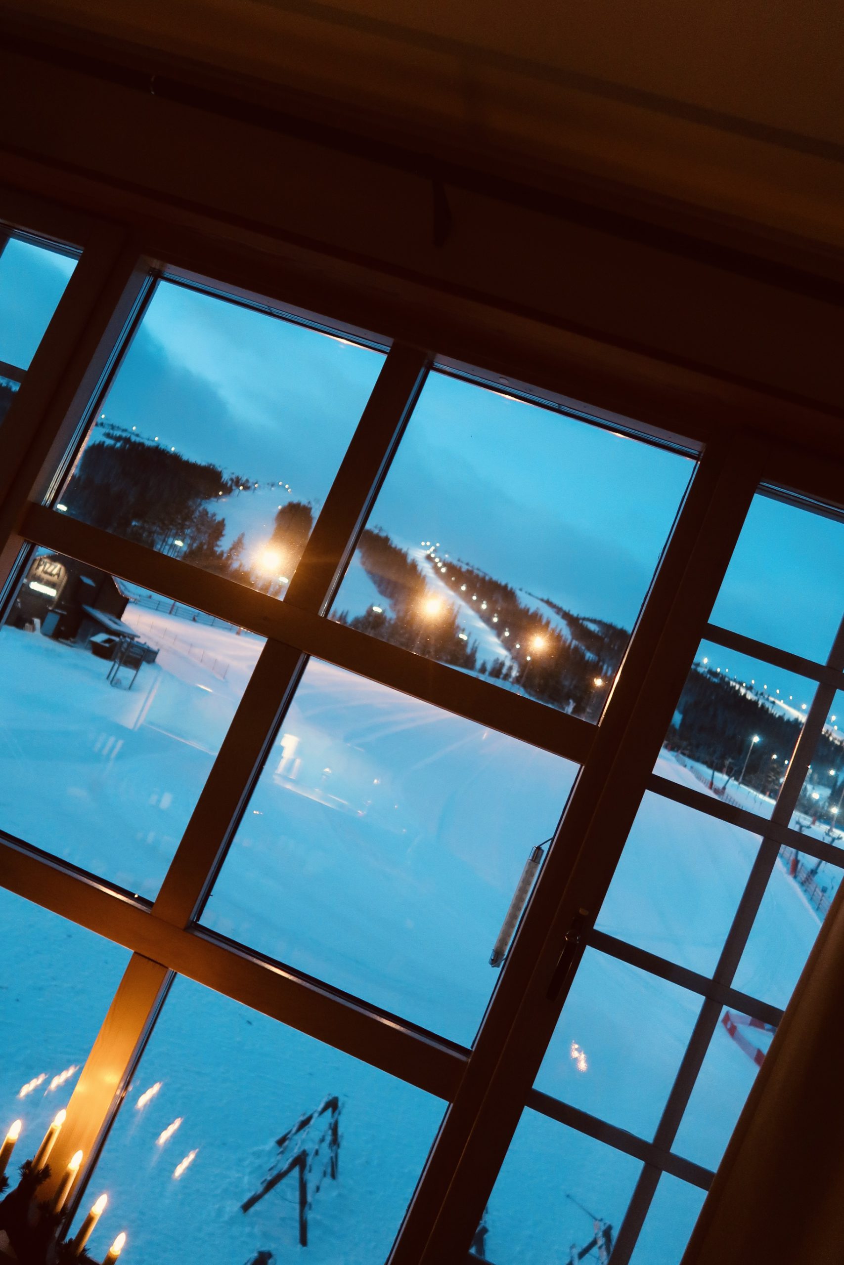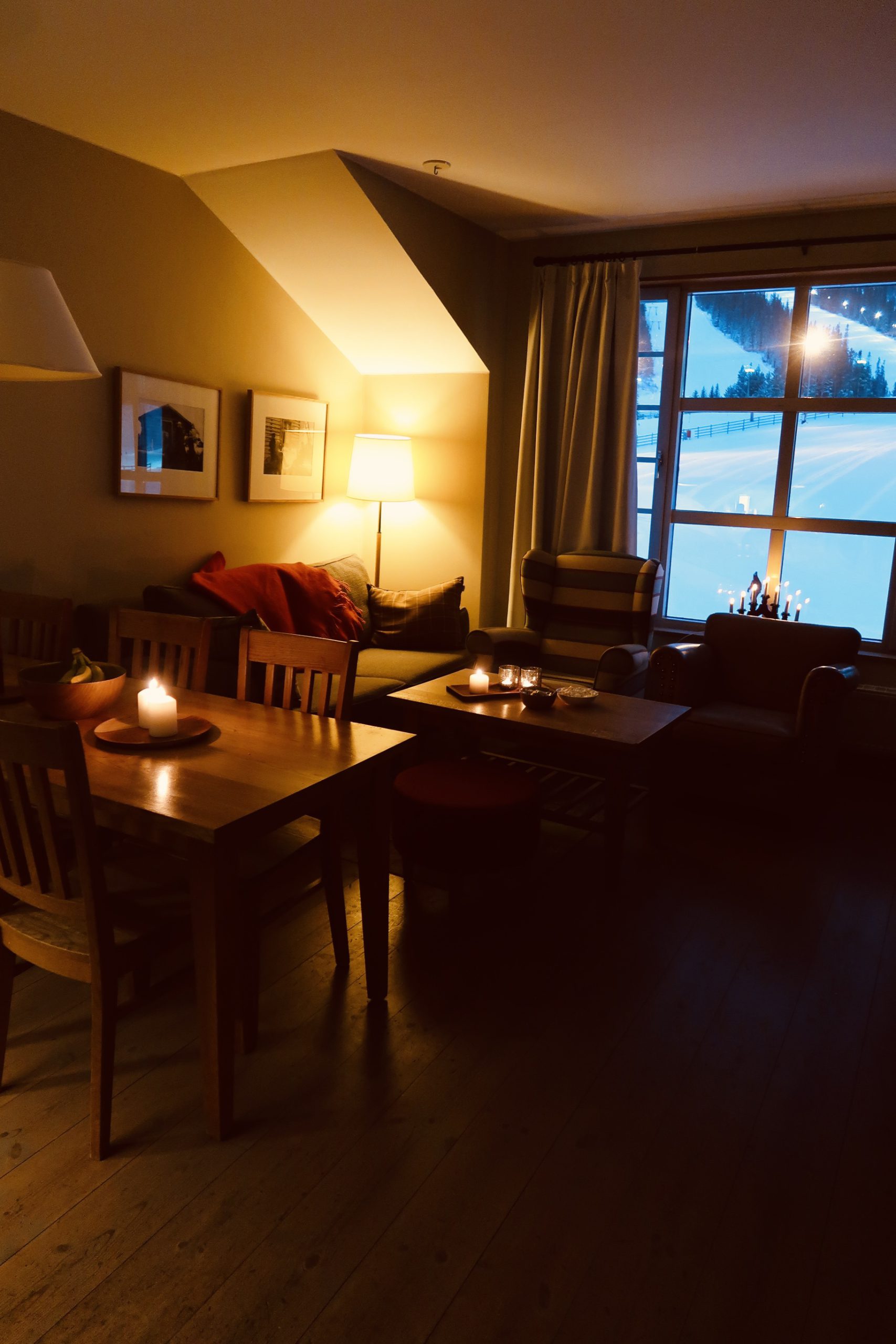 När klockan var en mer normal tid gick jag upp för och tände ljusen och mös en stund innan de andra vaknade. Vi bor så vi ser backen från vårt vardagsrumsfönster. Så fint!