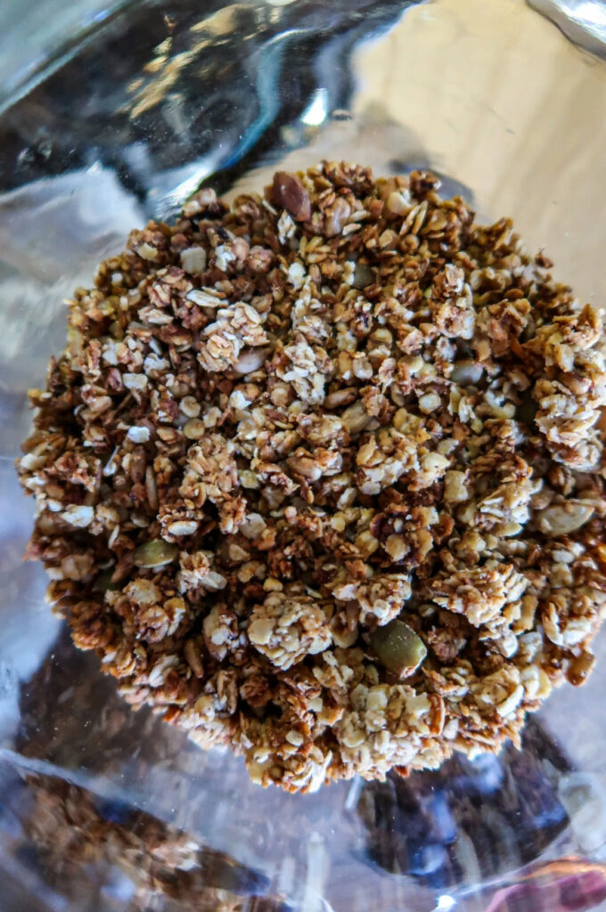 Jag förvarar granolan i en glasburk med lock, upplever dock att den är godast och håller sin knaprighet bäst om det inte är ett tätslutande lock. Jag har den i en sån här burk som du ser ovan, men vickar liksom bara igen locket utan att stänga det helt.