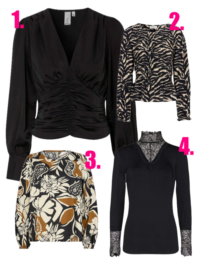 1.Svart blus (75% rabatt) // 2. Mönstrad blus (70% rabatt) // 3. Mönstrad blus i brun/beige (20% rabatt) // 4. Spetstopp