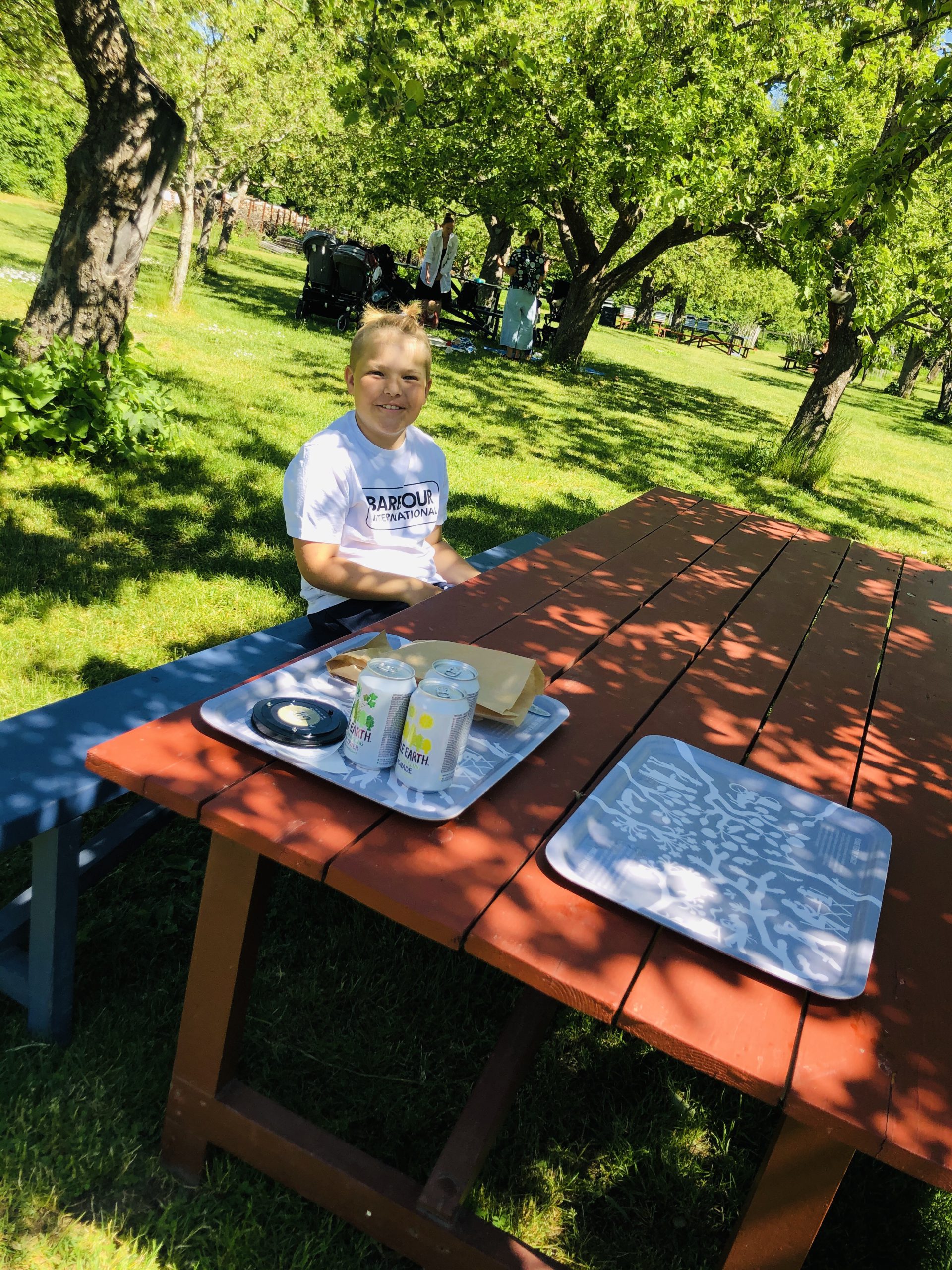 Här satt vi länge och bara njöt. Jag åt en sparrissallad och Milo och Tony åt en varsin varmrökt lax. Sen hann vi också med en fika innan vi gick vidare. Många sitter på filtar här och myser, man sitter under maaaassor av äppelträd.