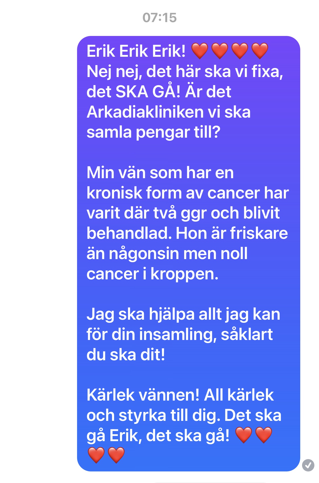 Har swishat ett bidrag. Håller tummarna att Erik ska få all hjälp han behöver! Drabbades själv av cancer för 2 år sedan. Hemsk sjukdom som ingen ska behöva gå igenom. ❤❤❤